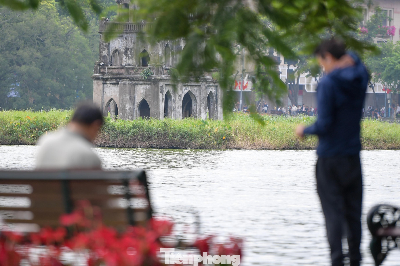 Khoảnh khắc đầu ngày khi Hà Nội sương mỏng phủ quanh mặt hồ, Tháp Rùa ẩn hiện như trong tranh. Ảnh: Trọng Tài