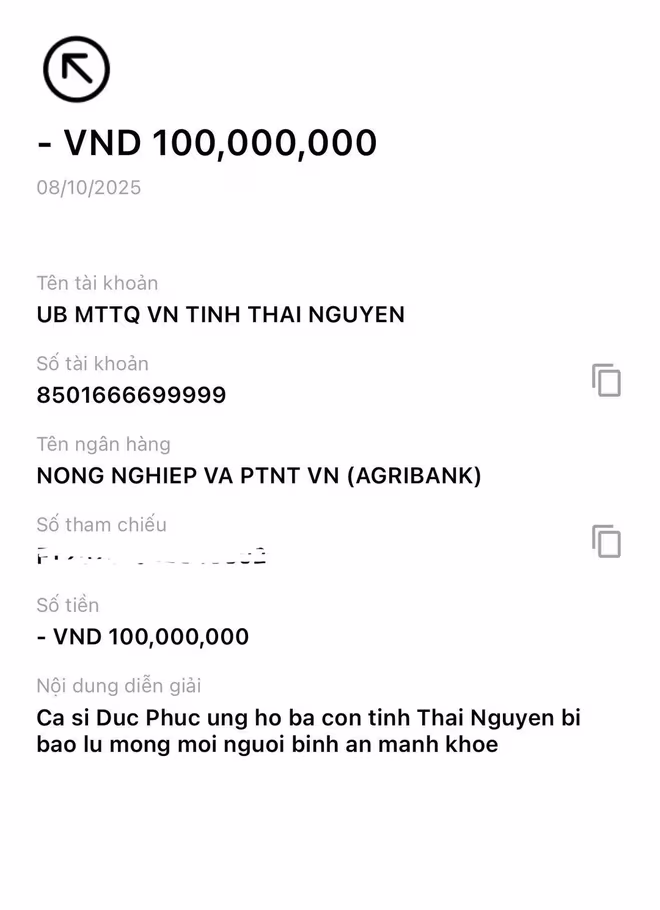 Tiếp nối nghĩa cử cao đẹp này, Đức Phúc đã quyết định chuyển tiếp 100 triệu đồng tới người dân trên địa bàn tỉnh Thái Nguyên đang oằn mình vượt qua ảnh hưởng bởi bão lũ.
