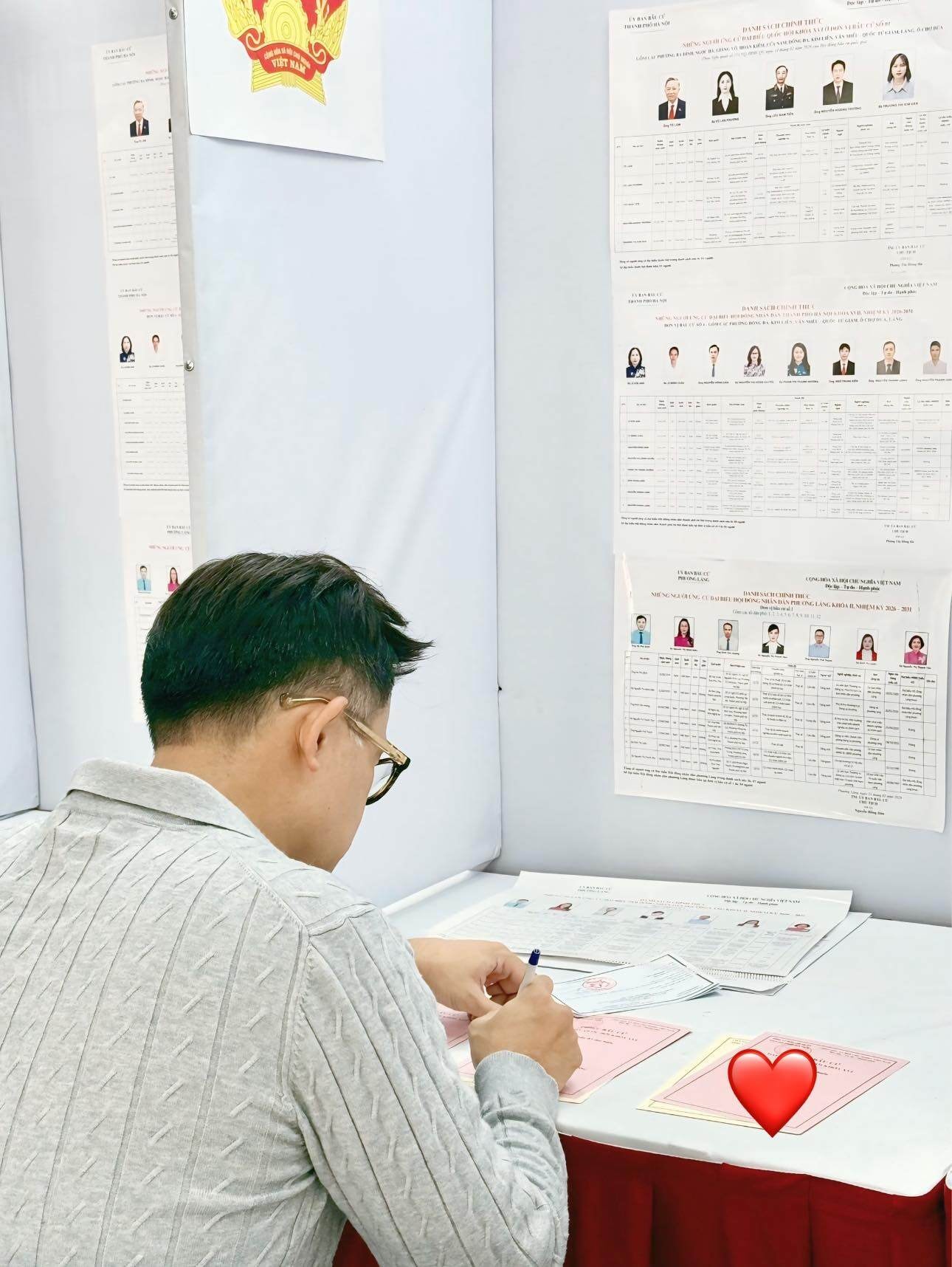 MC Đức Bảo và MC Nguyên Khang đều có mặt từ rất sớm tại điểm bỏ phiếu. MC Đức Bảo thực hiện nghĩa vụ tại phường Láng (Hà Nội), còn MC Nguyên Khang có mặt tại điểm bầu cử từ 6h30 sáng để kịp tiến độ công việc trong ngày.