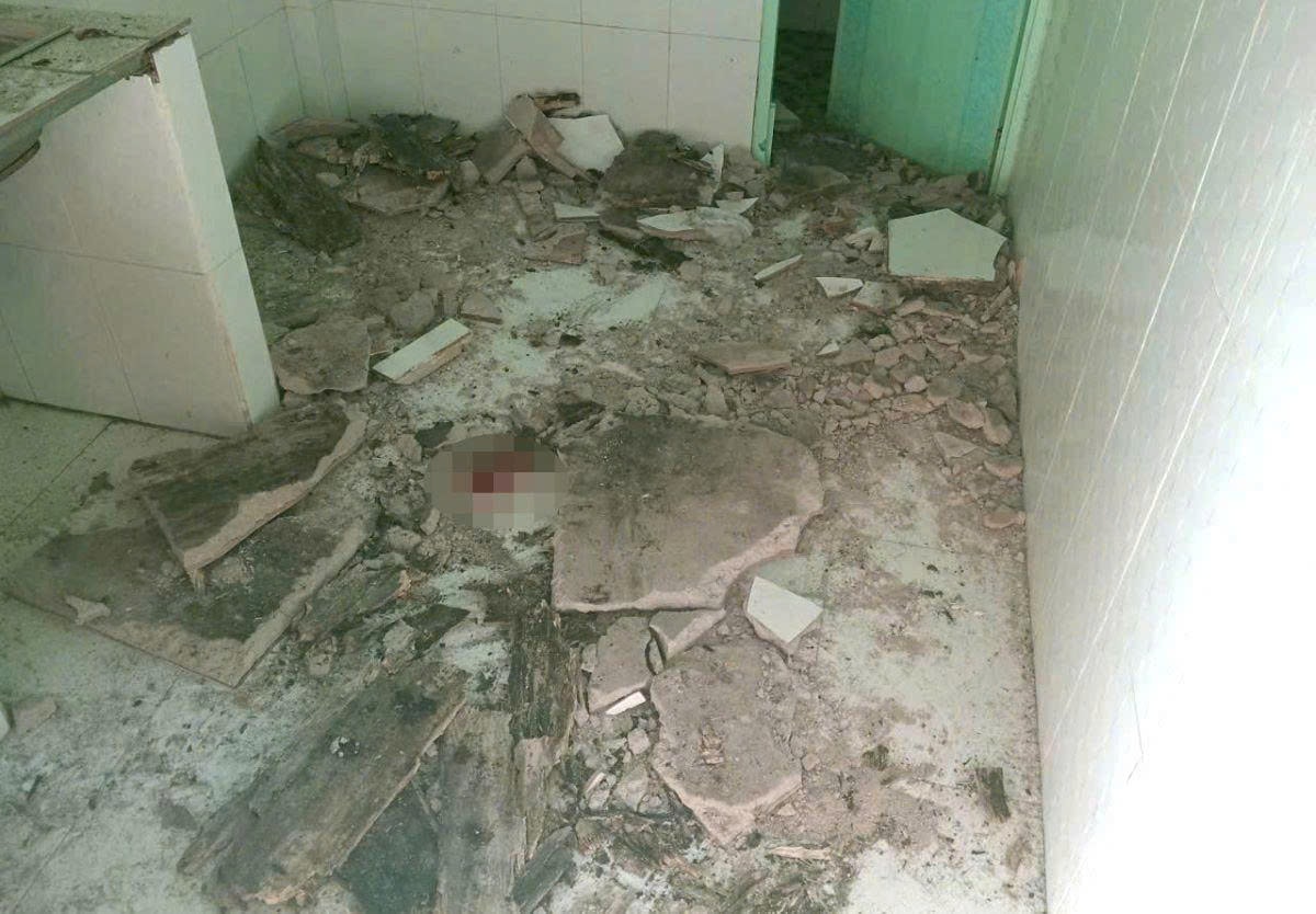 Cú sập khiến cả hai rơi từ trên cao xuống nền tầng trệt. Nhiều mảng bê tông lớn rơi theo, vỡ nát dưới sàn nhà.