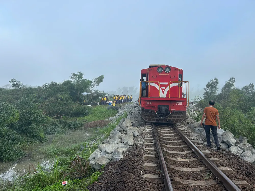 Song song đó, các đơn vị đang tiếp tục khắc phục hệ thống thông tin tín hiệu bị hư hại do bão, đồng thời thực hiện cảnh giới phục vụ chạy tàu chở đá ứng cứu, khắc phục cầu tạm tại Km1136+800.
