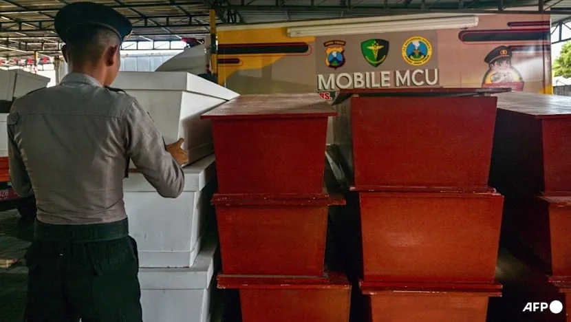 Cảnh sát xếp quan tài nạn nhân vụ sập trường Hồi giáo Al Khoziny tại bệnh viện Bhayangkara, Surabaya, Đông Java, ngày 4-10. Ảnh: Juni Kriswanto/AFP