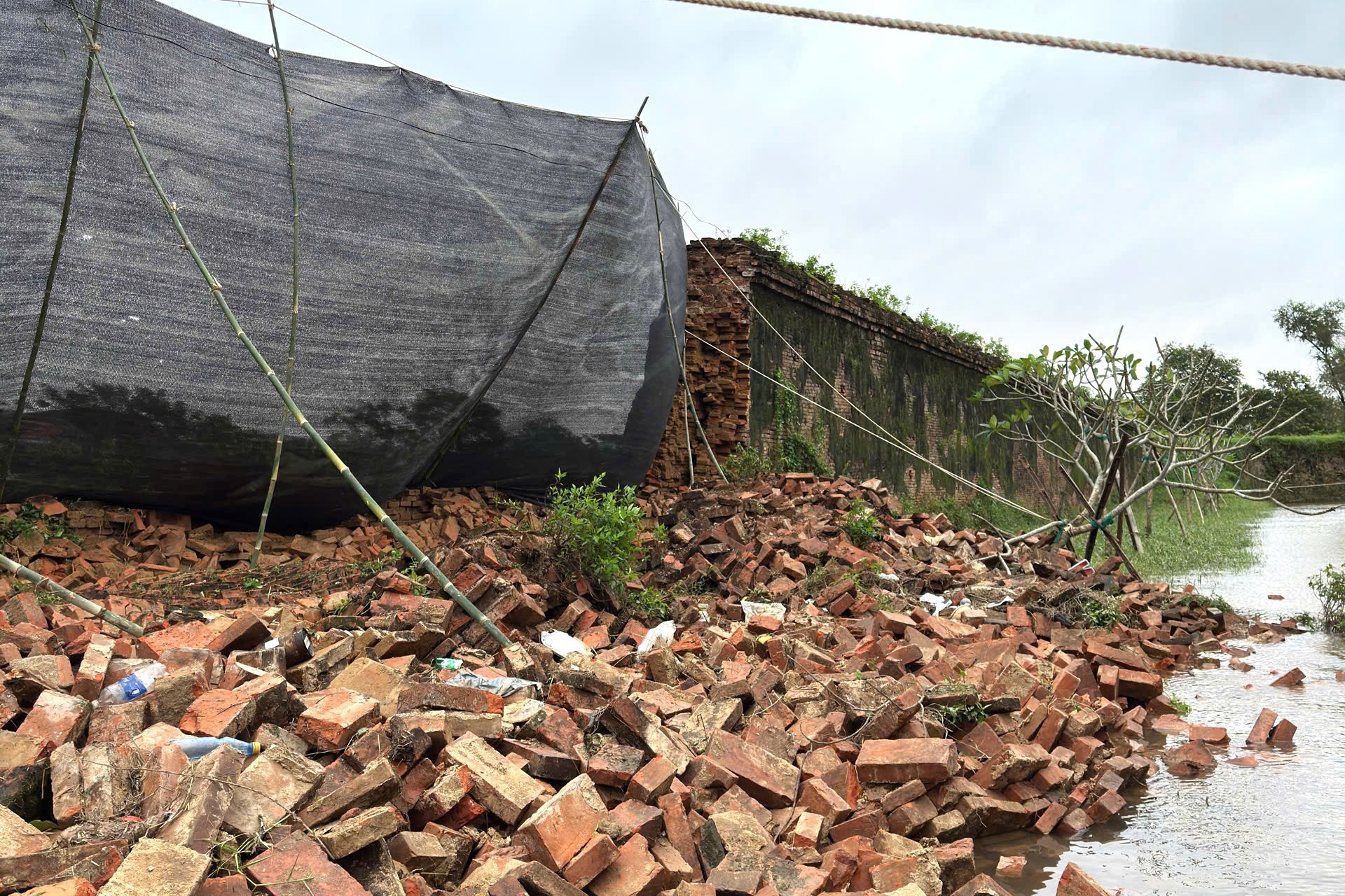 Sáng 3/11, Trung tâm phối hợp với đại diện Sở Xây dựng tiến hành khảo sát, đánh giá hiện trạng. Theo ghi nhận, phần tường bị sập gồm nhiều viên gạch vồ tách rời, thiếu liên kết khối. Kết cấu tường gồm ba lớp, trong và ngoài xây bằng gạch vồ, lớp giữa độn đất sét. Một số đoạn tường lân cận có dấu hiệu nghiêng vào trong, rạn nứt, kết cấu yếu, có nguy cơ tiếp tục dịch chuyển nếu mưa lớn kéo dài.