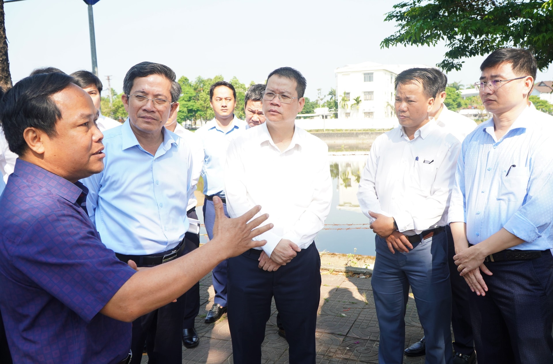 Lãnh đạo Trường THCS Nguyễn Du (ngoài cùng bên trái) báo cáo với lãnh đạo thành phố về phương án sử dụng trụ sở Hội Văn học - Nghệ thuật tỉnh Quảng Nam (cũ) khi được bàn giao cho trường. Ảnh: VINH ANH