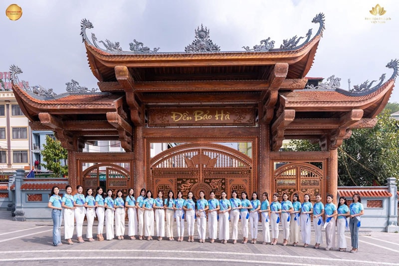 Thí sinh dự thi Hoa hậu Du lịch chụp ảnh lưu niệm tại đền Bảo Hà. Ảnh: Ban Tổ chức