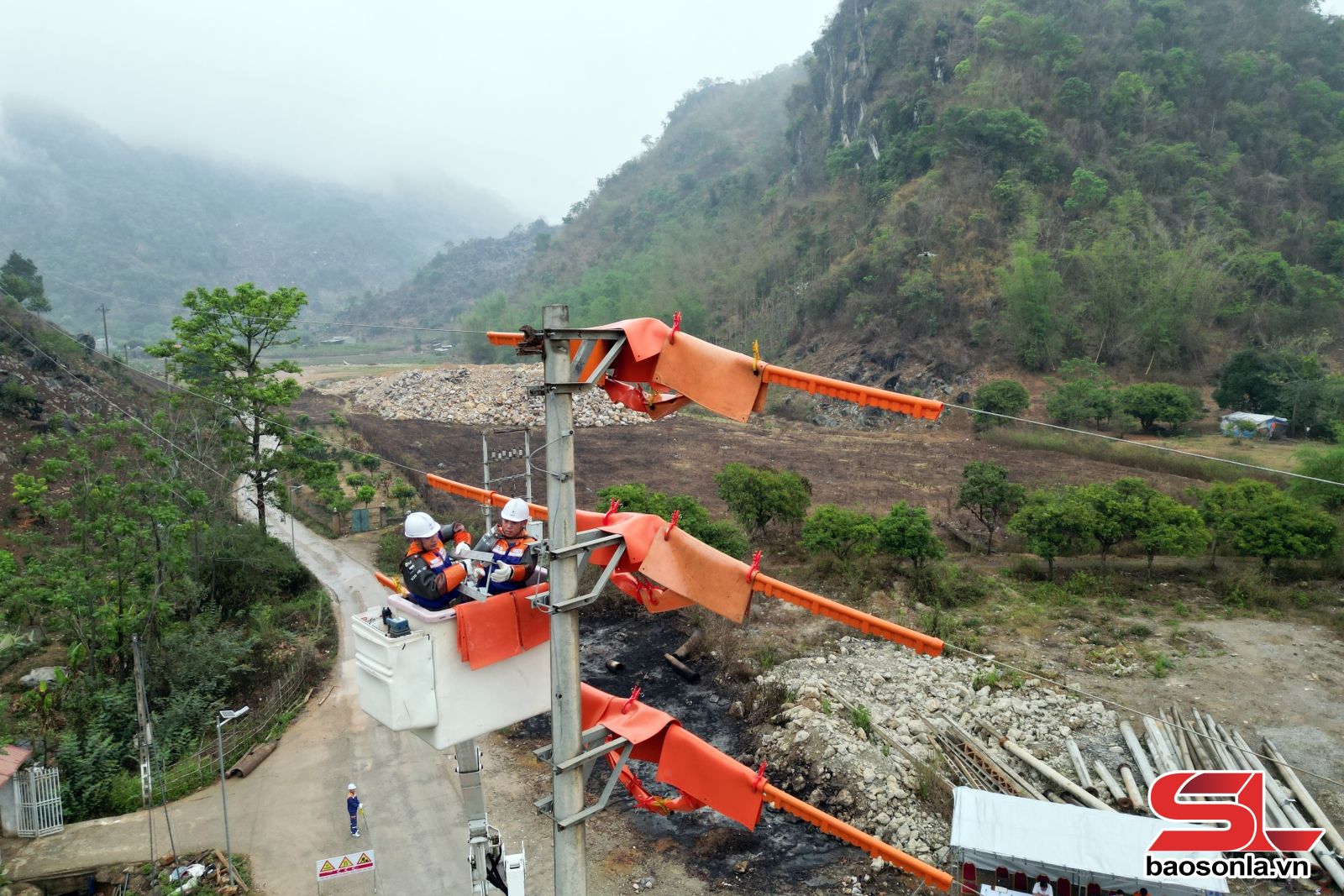 Công nhân Đội sửa chữa hotline chuẩn bị vật tư sửa chữa điện trên Trạm biến áp Huổi Hin 1.