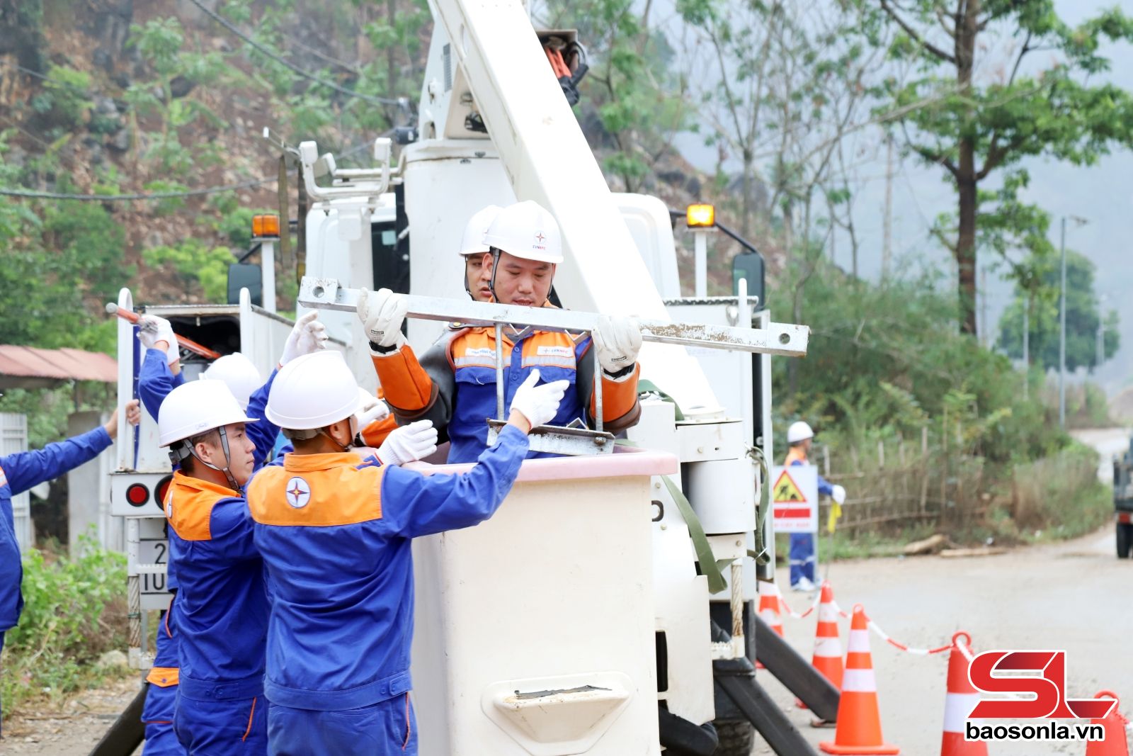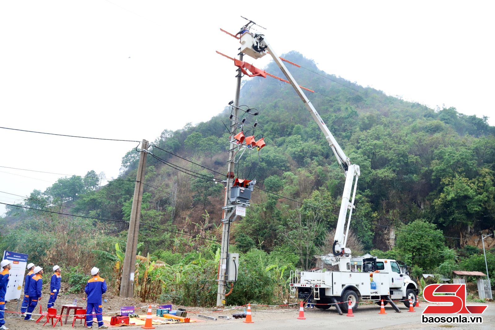 Công nhân tham gia sát hạch được thực hành tại Trạm biến áp Huổi Hin, phường Chiềng Sinh, thực hiện lắp đặt xà sứ cùng các phụ kiện trên đường dây 22 kV. Đặc biệt, việc đấu nối đường dây và trạm biến áp mới vào hệ thống đang vận hành trong điều kiện không cắt điện; việc thực hiện phải bảo đảm diễn ra nhanh chóng, an toàn và hiệu quả.