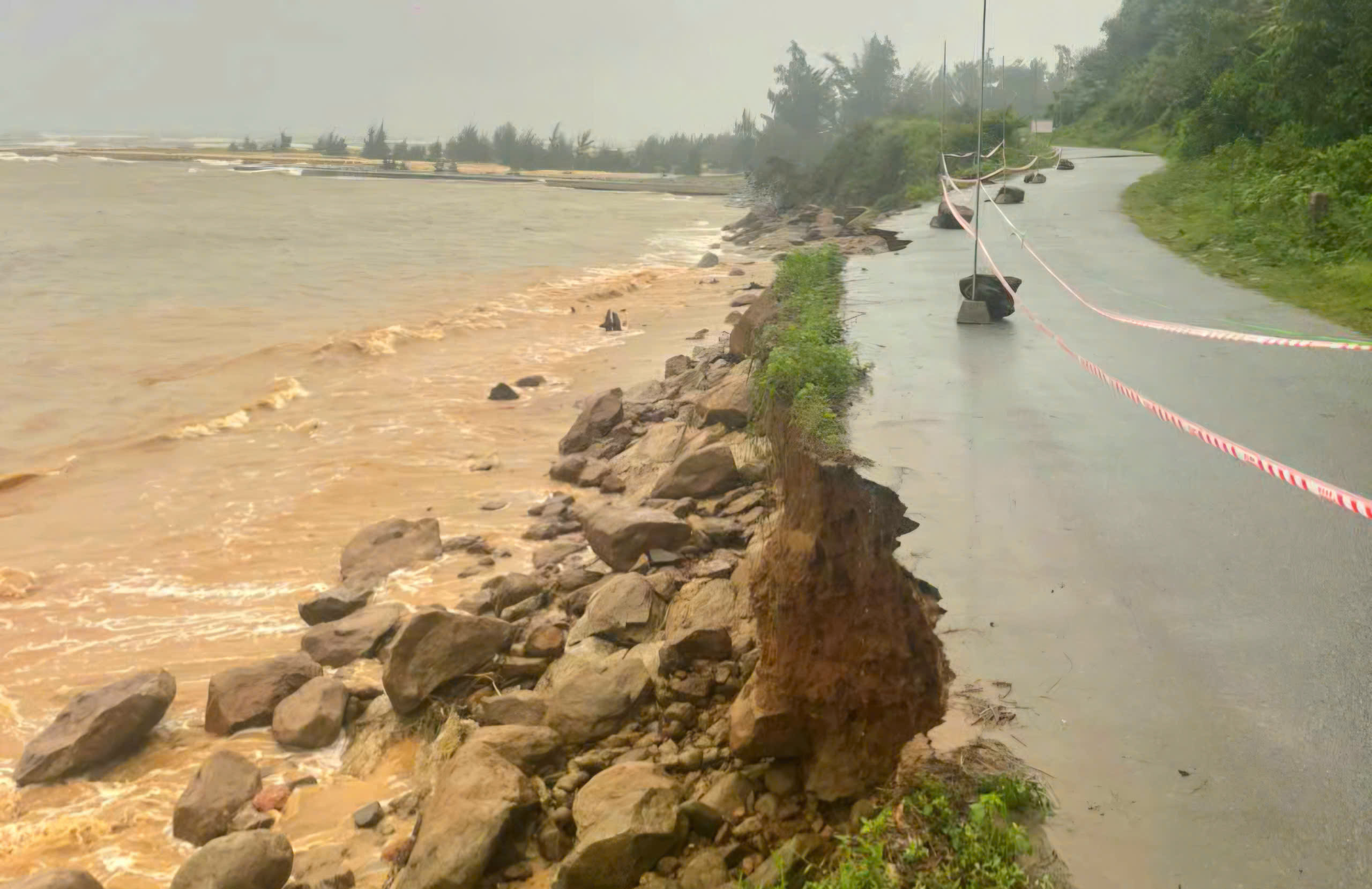 Do ảnh hưởng của bão số 12, mưa lớn, triều cường cùng với sóng mạnh làm tuyến đường ven biển thôn Tân An Hải (xã Phú Lộc) bị sạt lở nghiêm trọng, nguy cơ gây chia cắt hàng chục hộ dân.