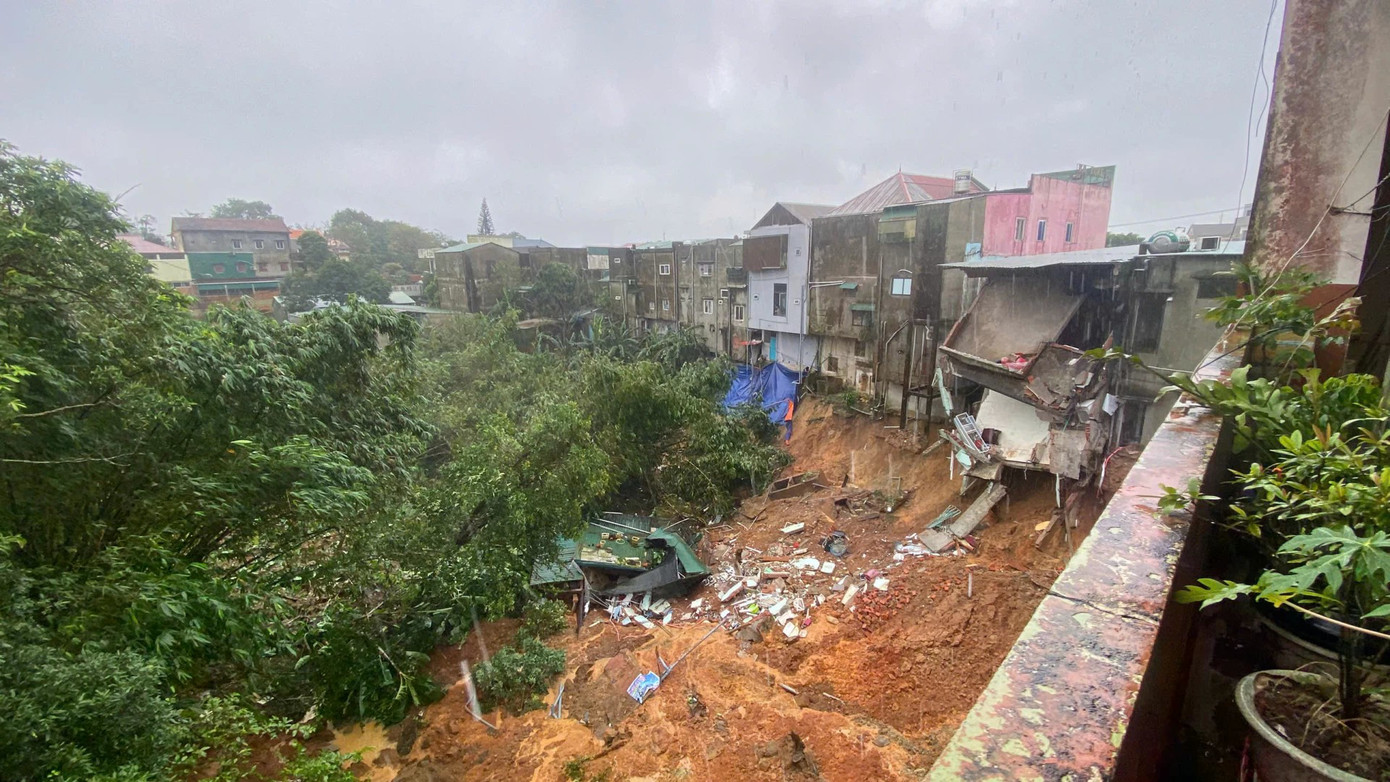 Đến hơn 14 giờ cùng ngày, mưa lớn tiếp tục dồn dập khiến 11 căn nhà liền kề dọc tuyến đường Hùng Vương bị hở hàm ếch phần móng phía sau. Một số nhà lung lay, xuất hiện vết nứt tường, tiềm ẩn nguy cơ đổ sập bất cứ lúc nào.