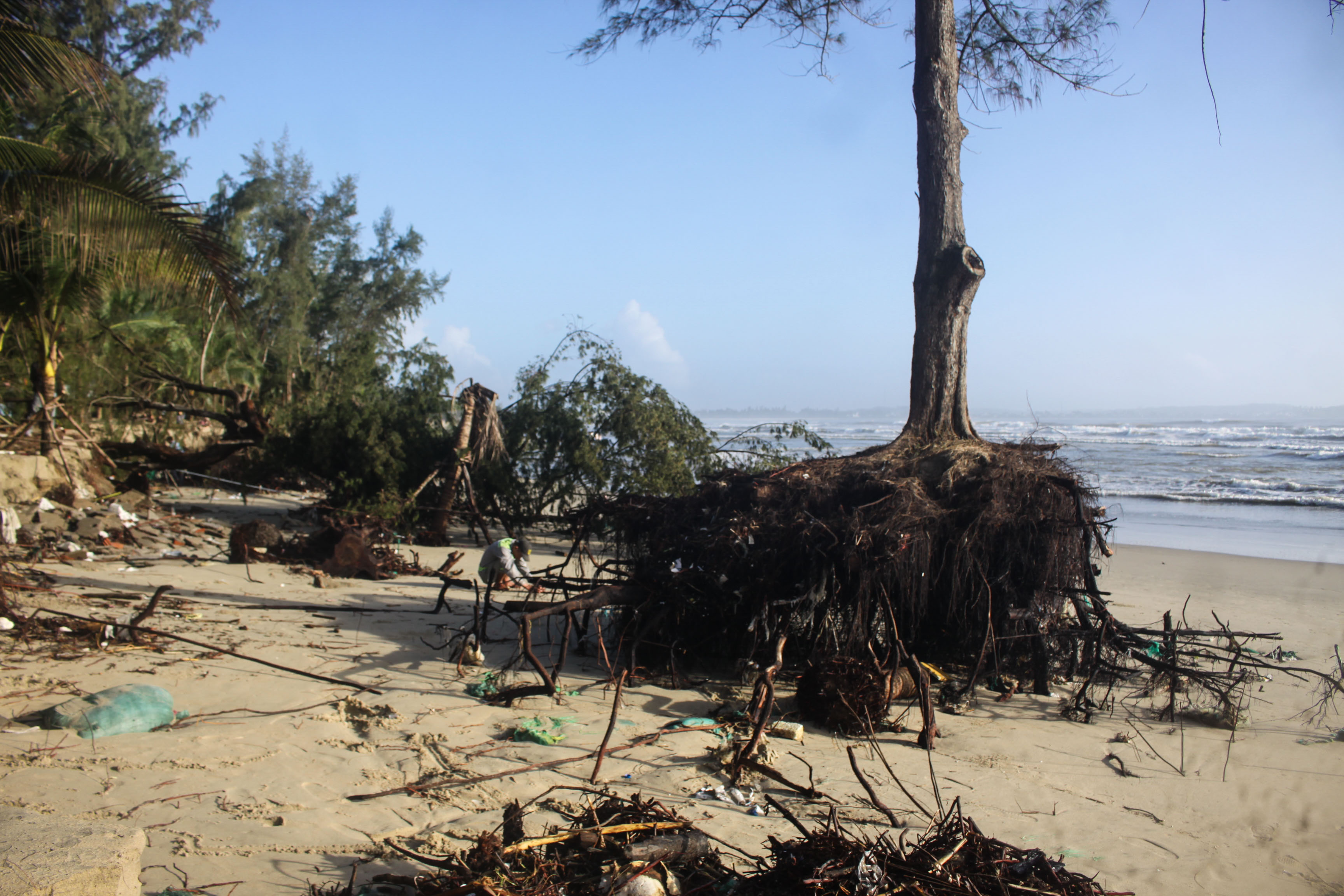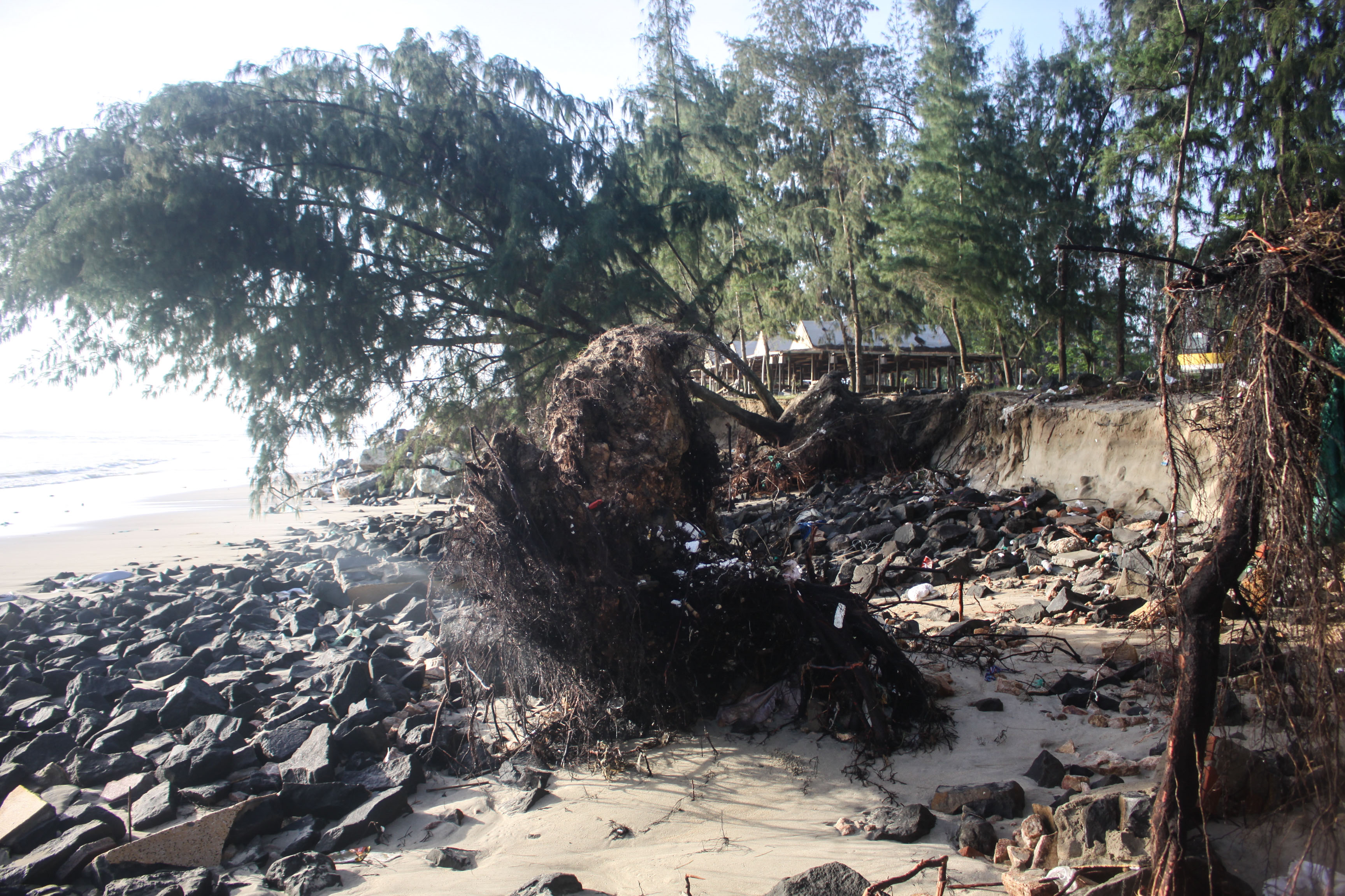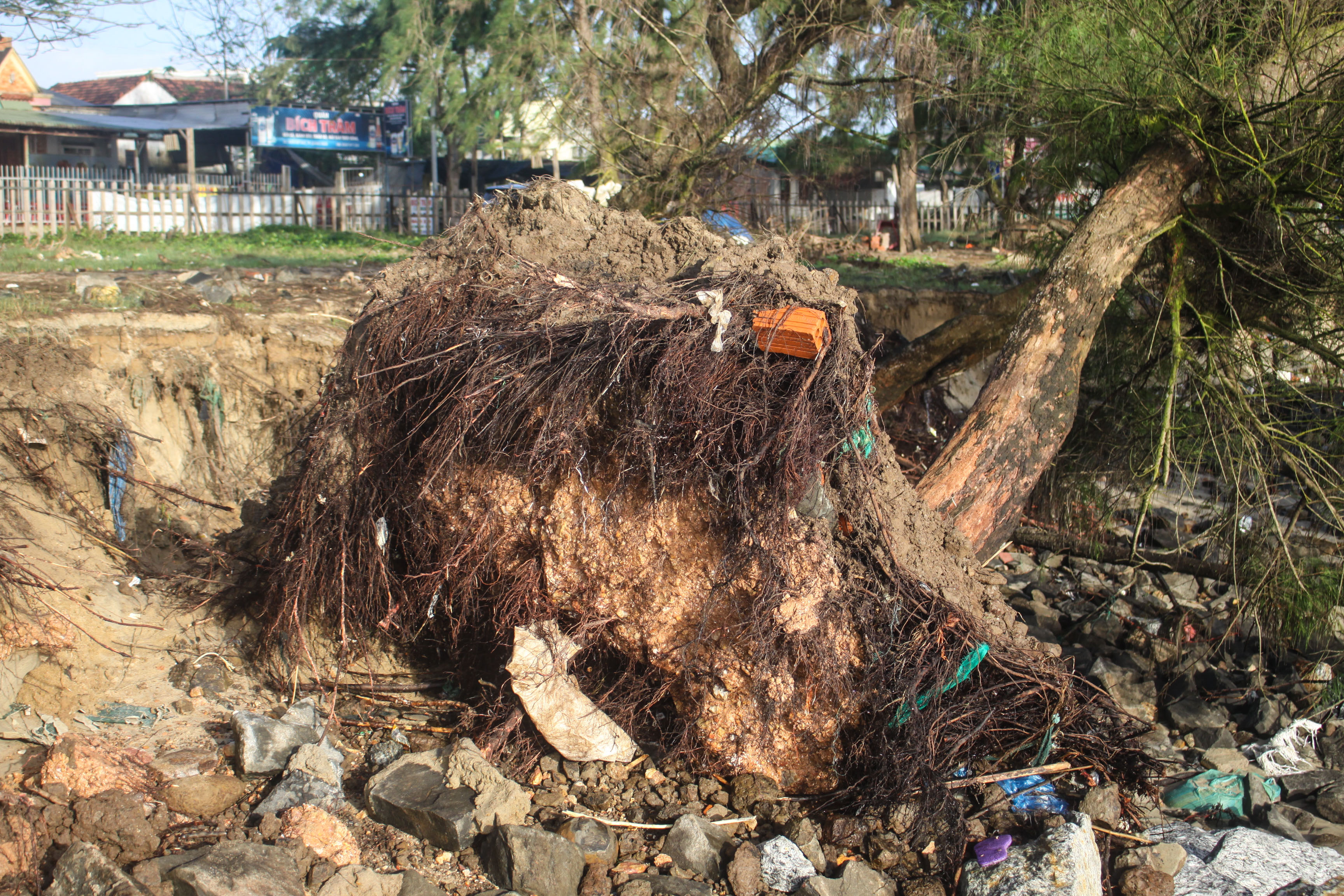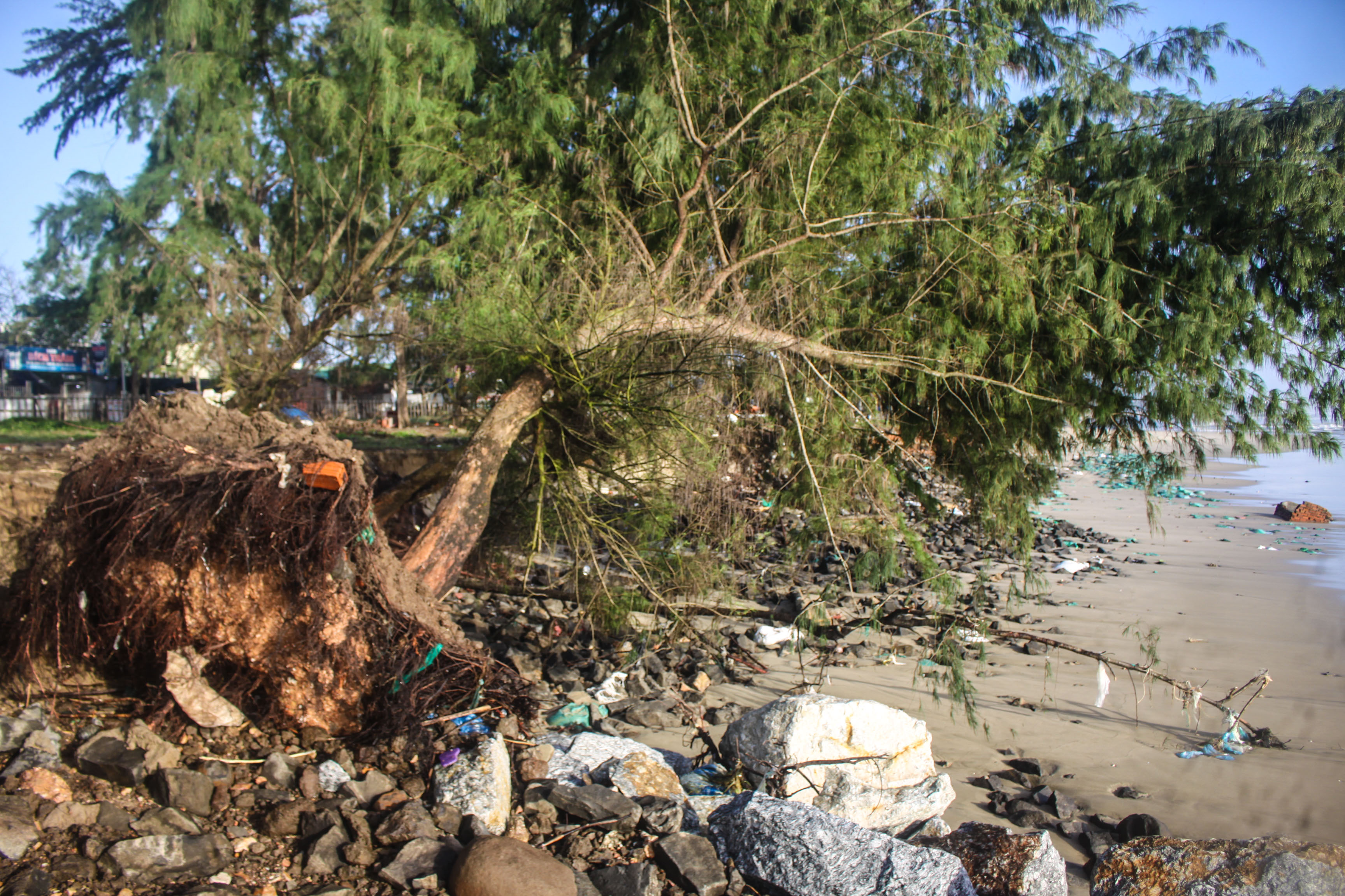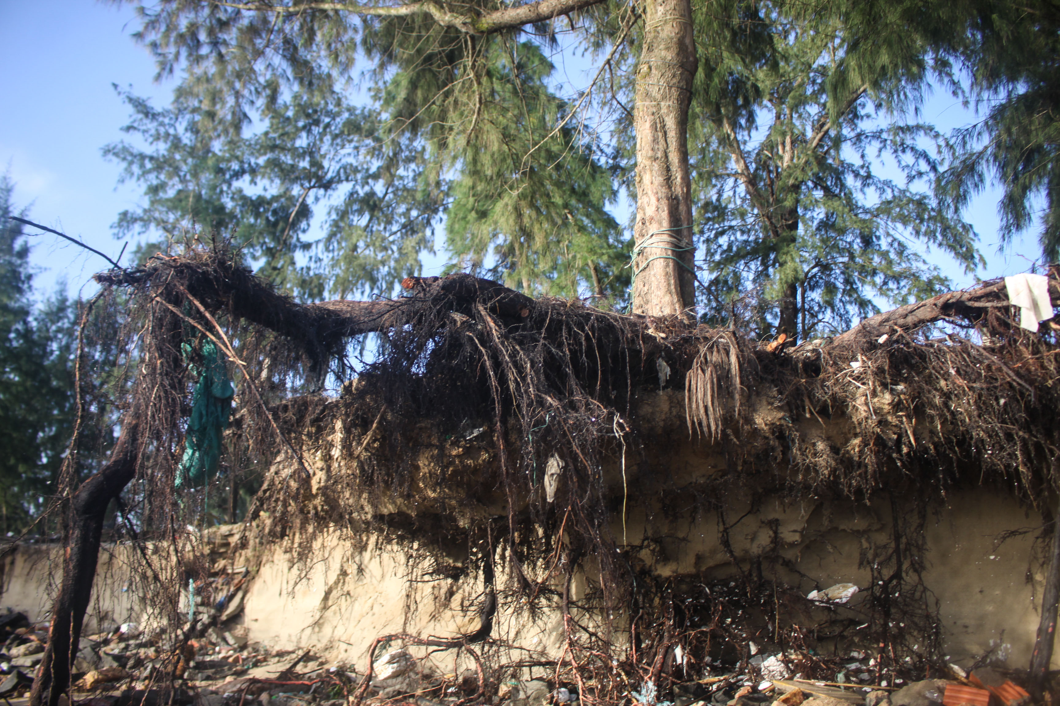 Cây dương liễu bị sóng biển đánh trơ gốc. Ảnh: NGUYỄN TRANG