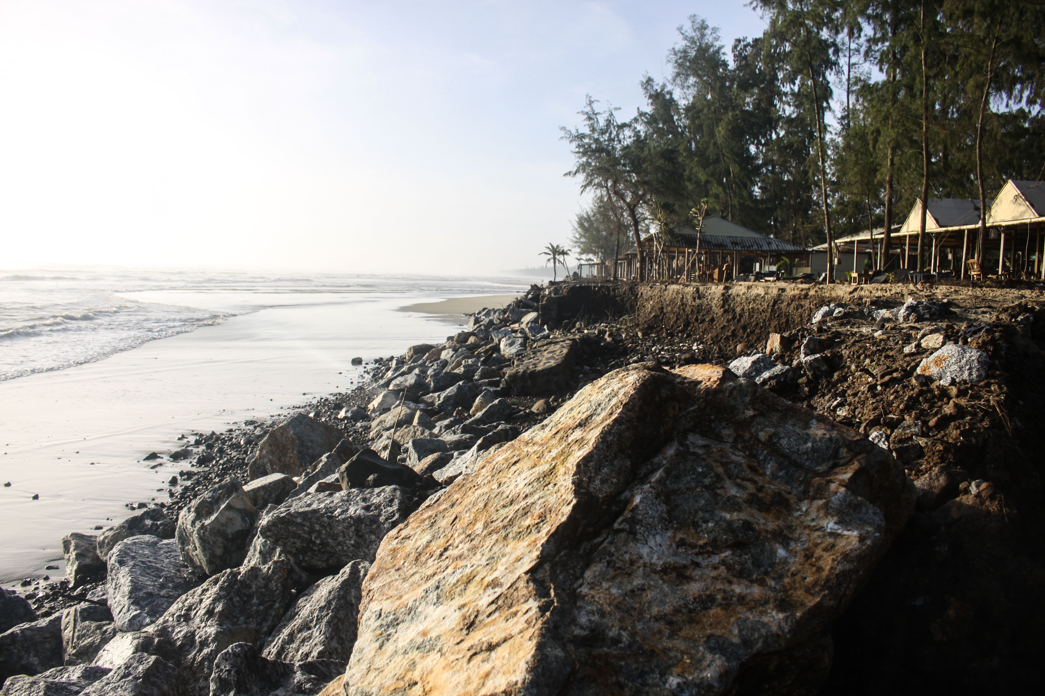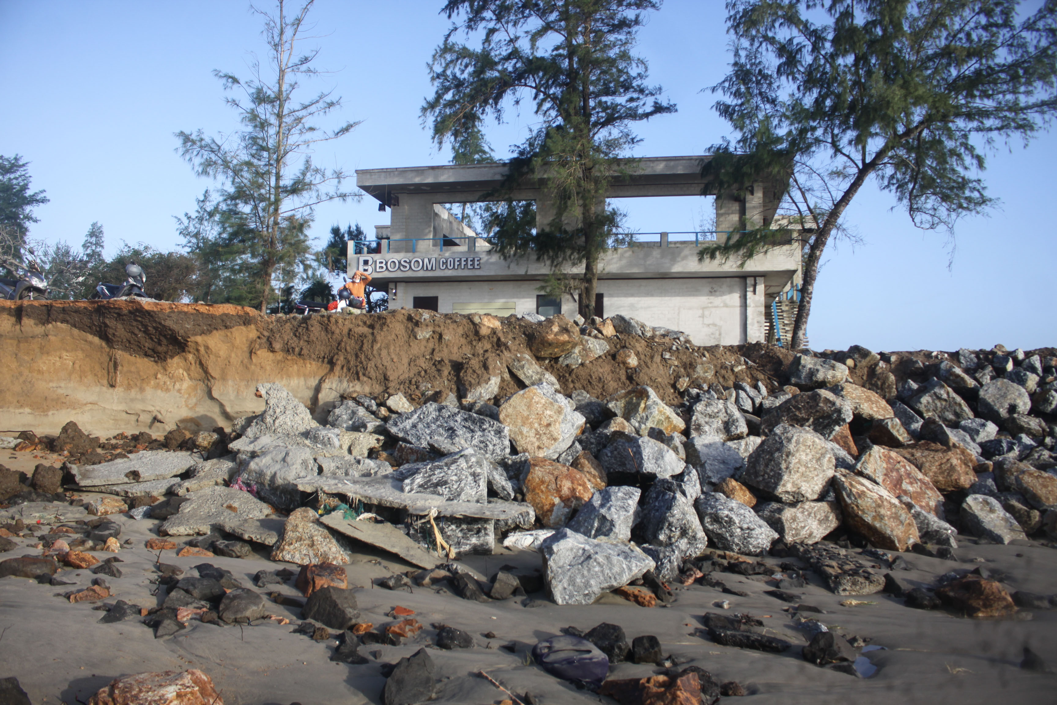 Chủ quán đã đổ đá kè bãi biển nhưng vẫn bị sóng đánh sập. Ảnh: NGUYỄN TRANG