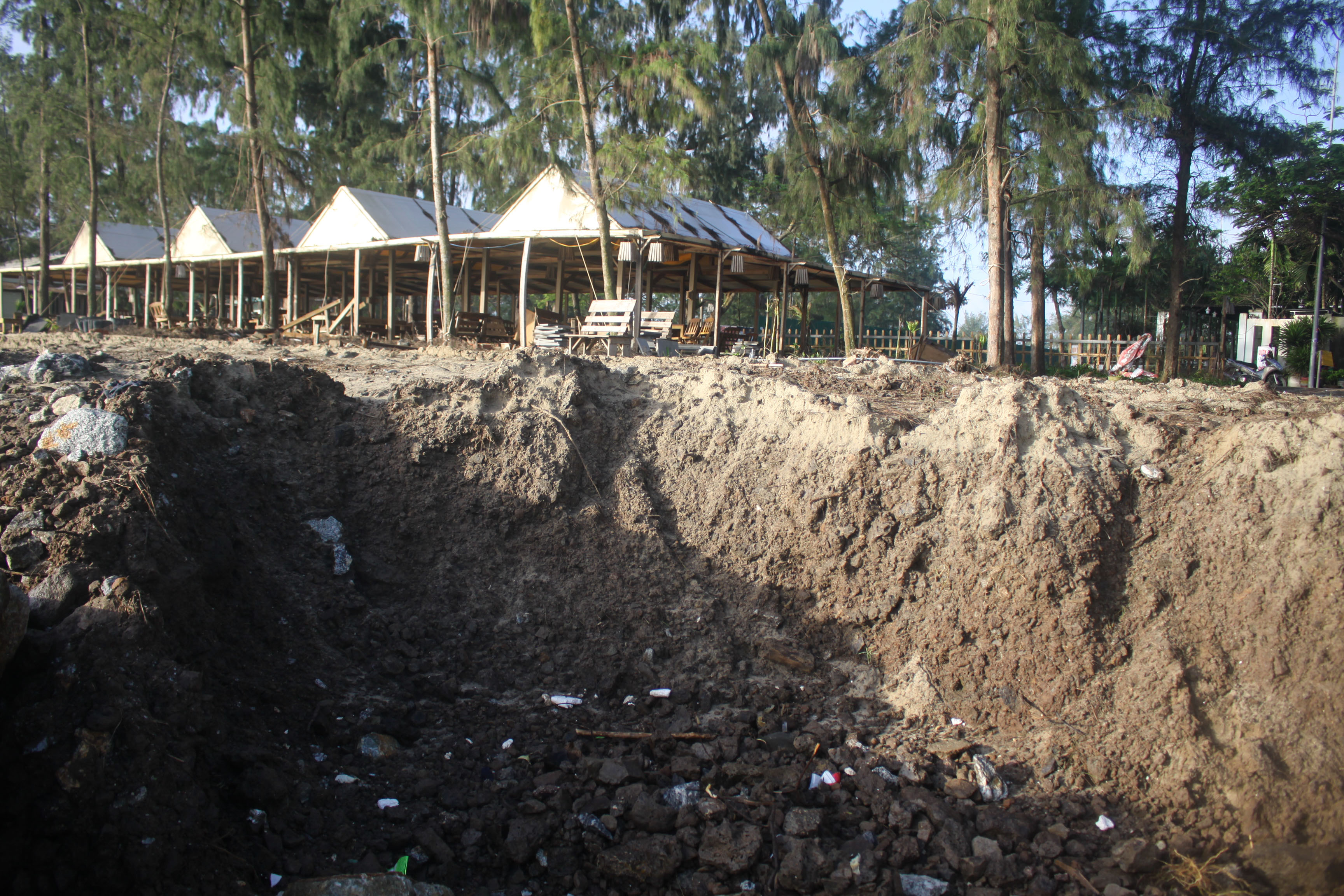 Trong khi đó, triều cường tiếp tục xâm thực dữ dội, khoét sâu các bờ cát dài dọc bãi biển, khiến nhiều đoạn sạt lở nham nhở, tạo thành những “tường thành”cao hơn 2m, tiềm ẩn nguy cơ sạt lở lớn và đe dọa “xóa sổ” bãi biển