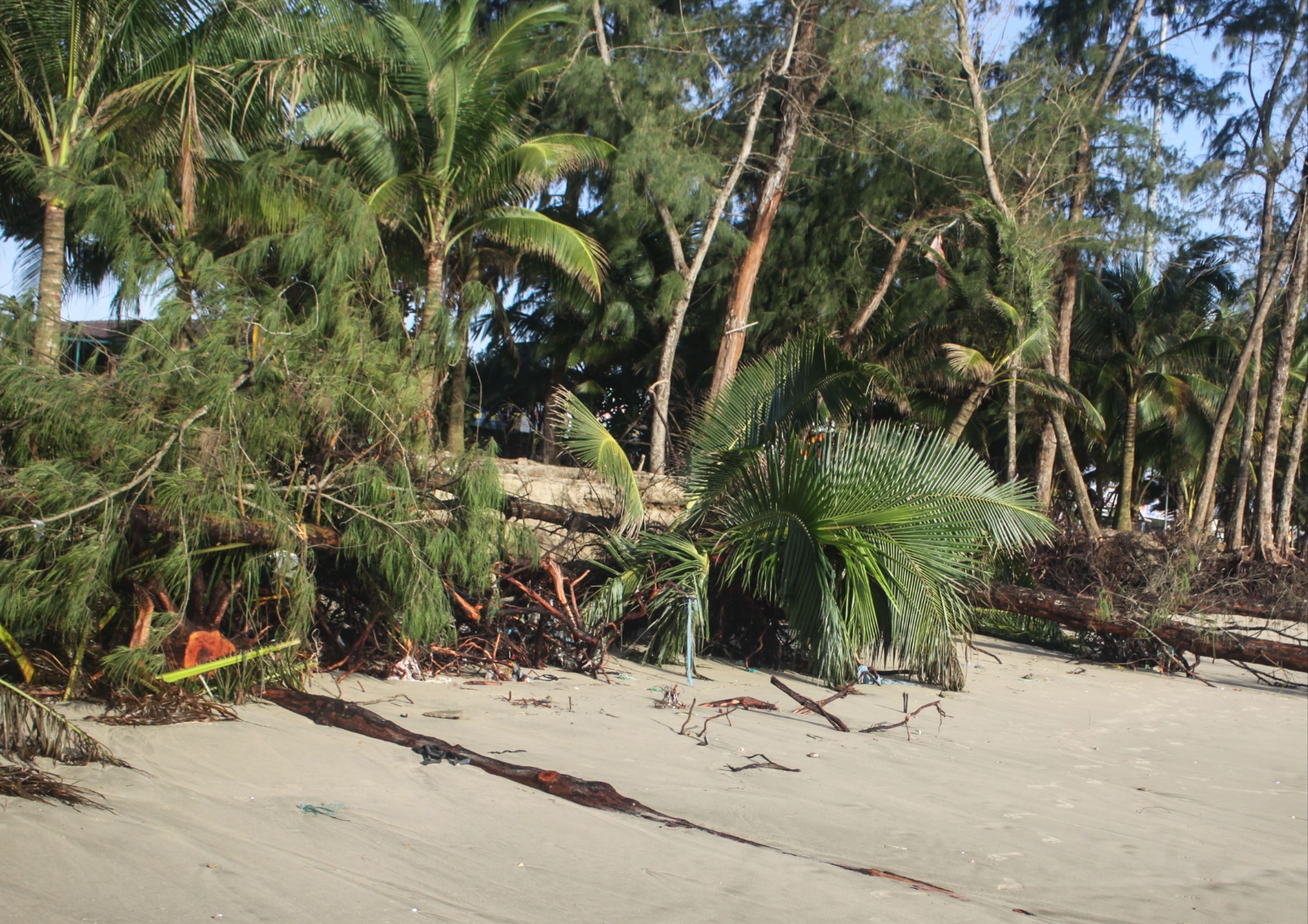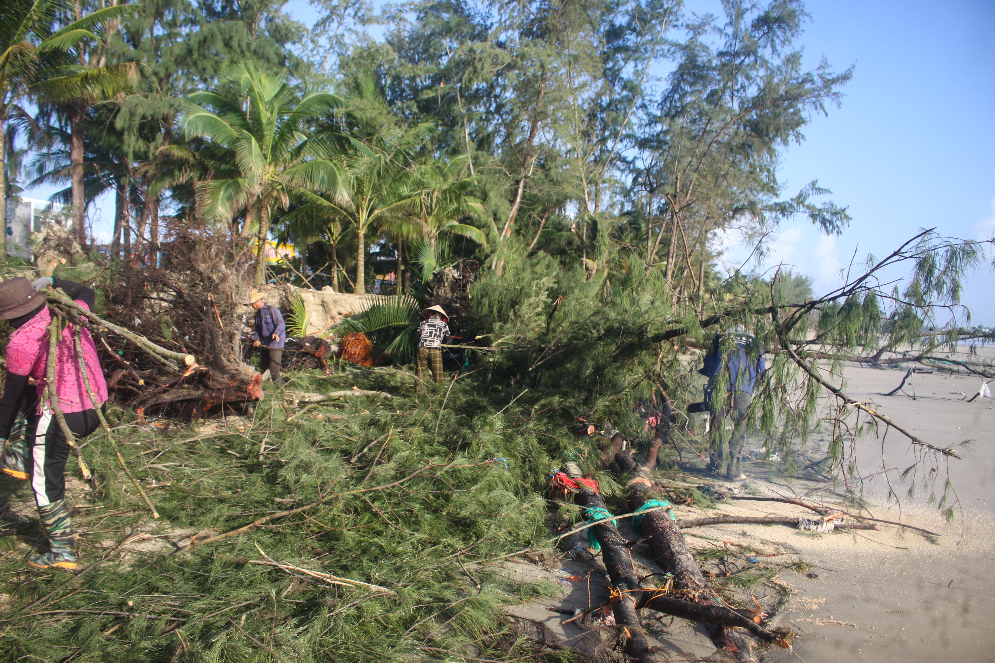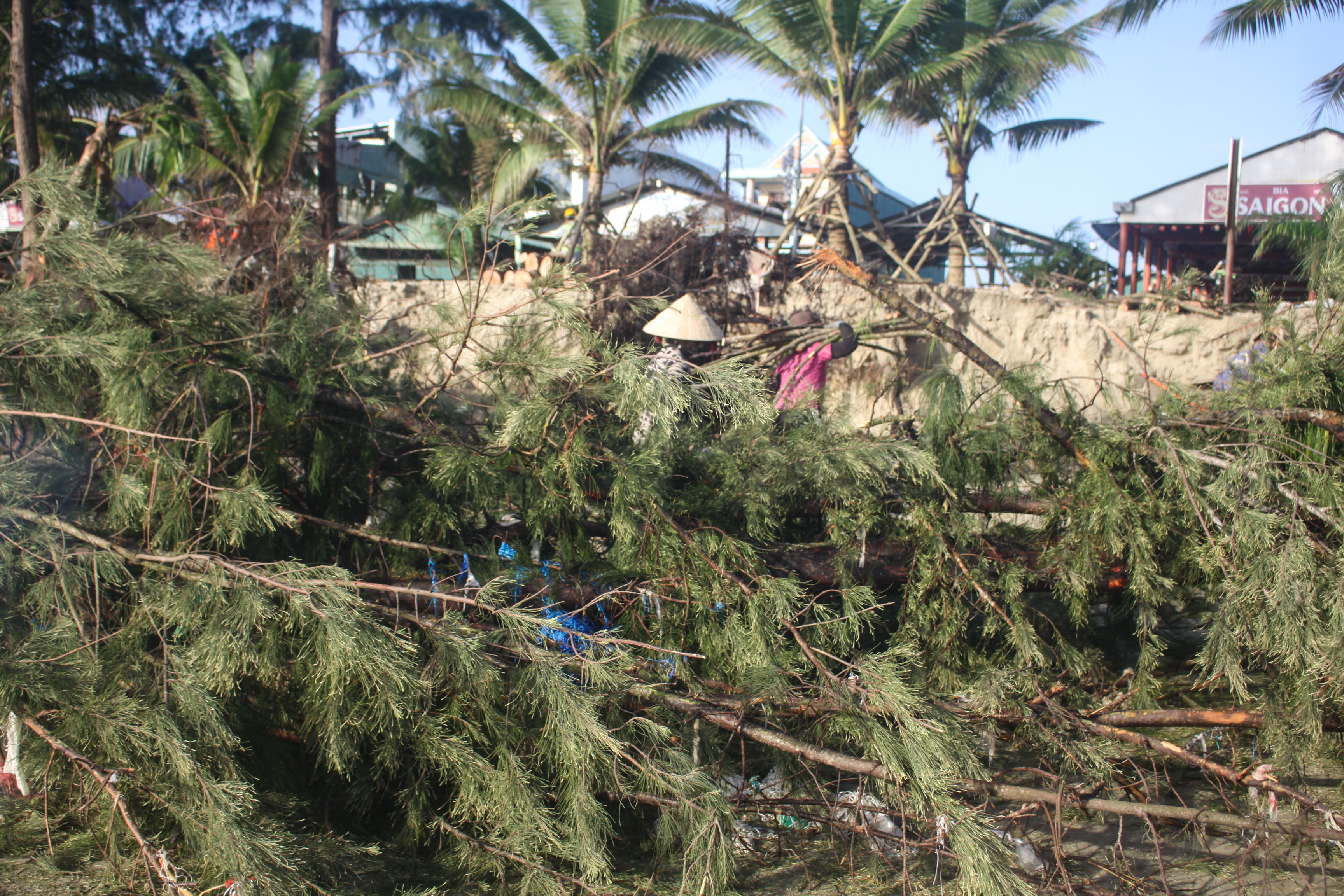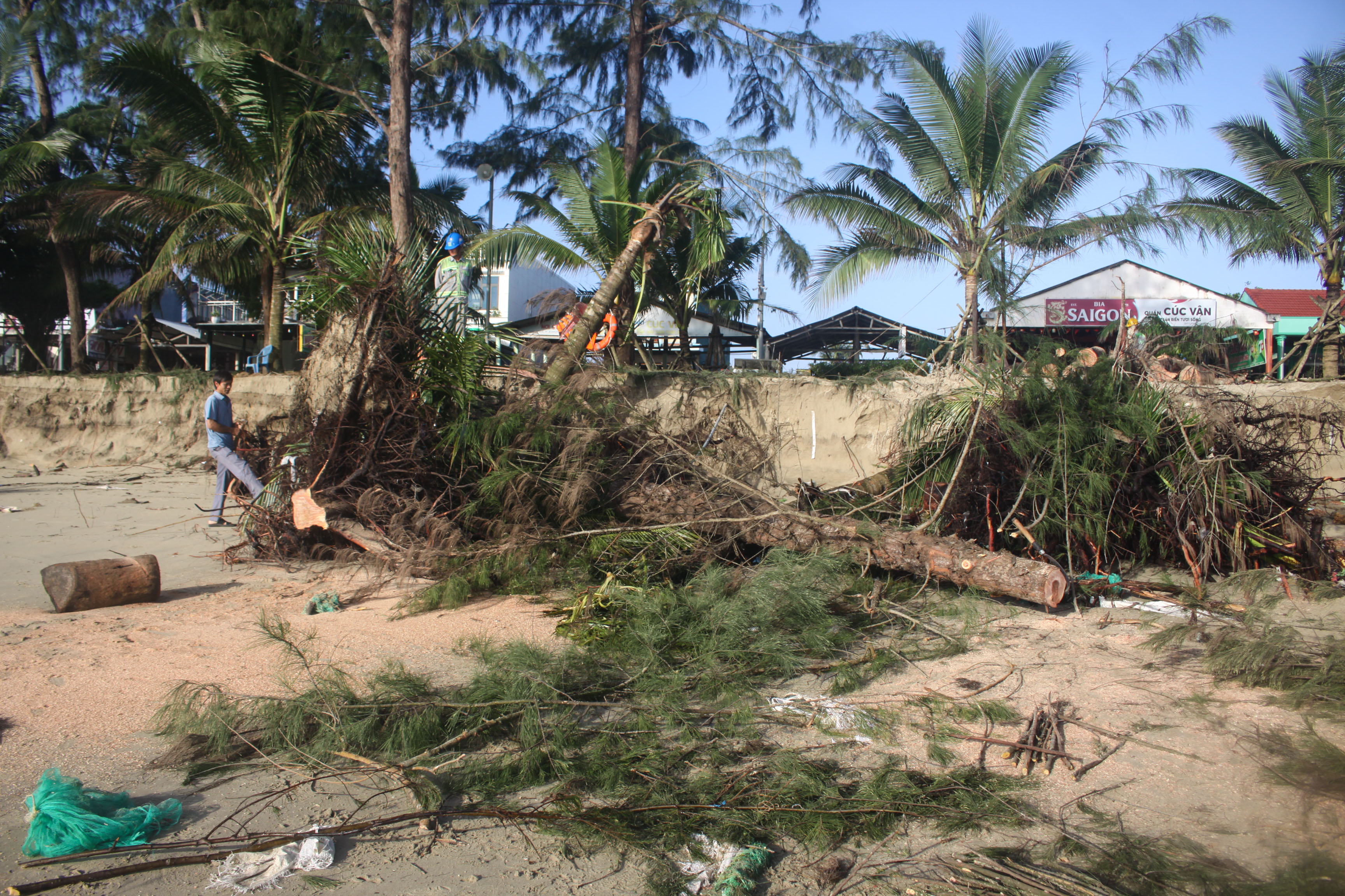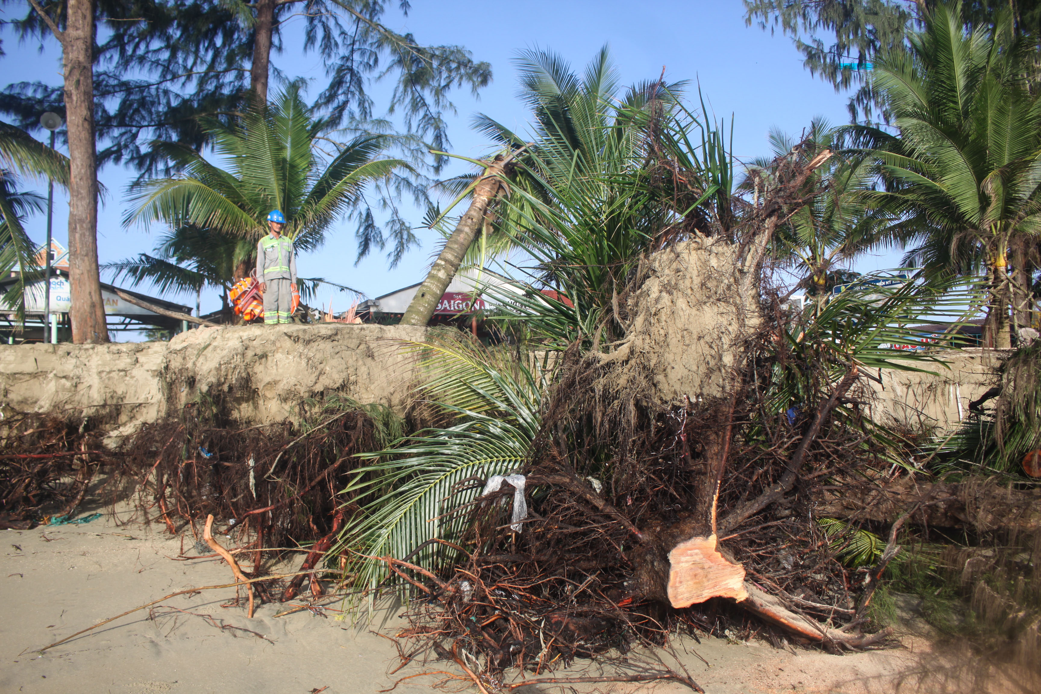 Nhiều cây dừa dọc bãi biển Mỹ Khê, xã Tịnh Khê, bị sóng đánh ngã. Ảnh: NGUYỄN TRANG