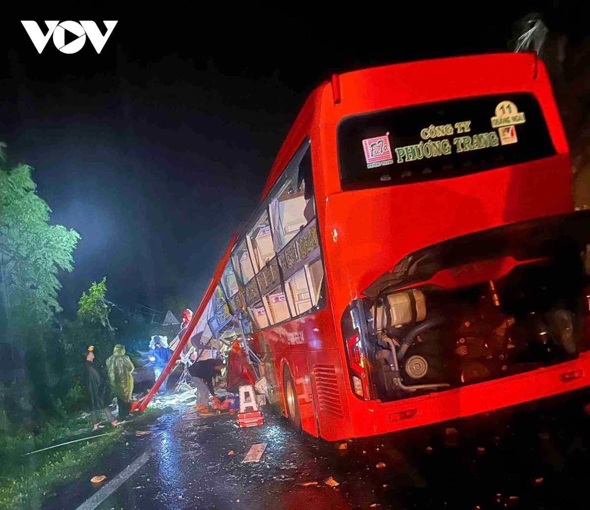 Xe khách mang biển kiểm soát 59H-53114 của hãng Phương Trang đang lưu thông hướng Đà Lạt - Nha Trang thì bị đất đá từ taluy dương đổ ập xuống, trúng trực diện vào sườn phải. Lực va đập mạnh khiến phương tiện hư hỏng nặng, nhiều người bị kẹt bên trong.