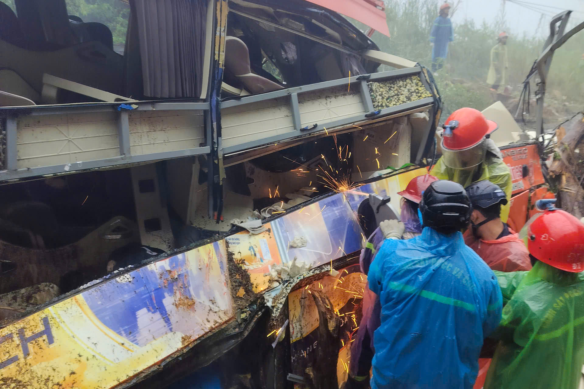 Vụ sạt lở khiến phần cabin xe khách bị tách rời, thân xe biến dạng, vỡ kính, làm nhiều người mắc kẹt bên trong.