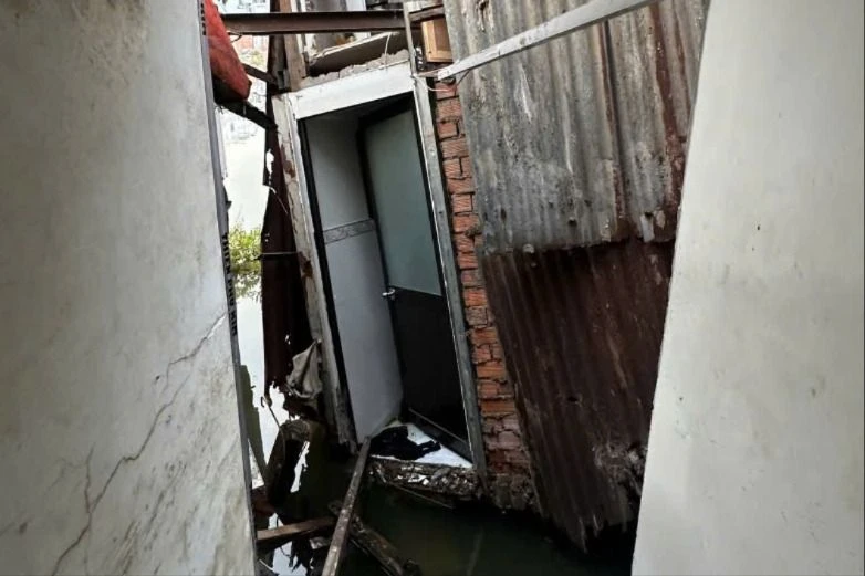 Khoảng 17,5 m² nhà dân ven kênh Đôi, phường Chánh Hưng bị sạt lở, đổ sập xuống kênh. UBND phường đã phong tỏa hiện trường, hỗ trợ người dân và triển khai biện pháp khắc phục. Ảnh: Xuân Minh
