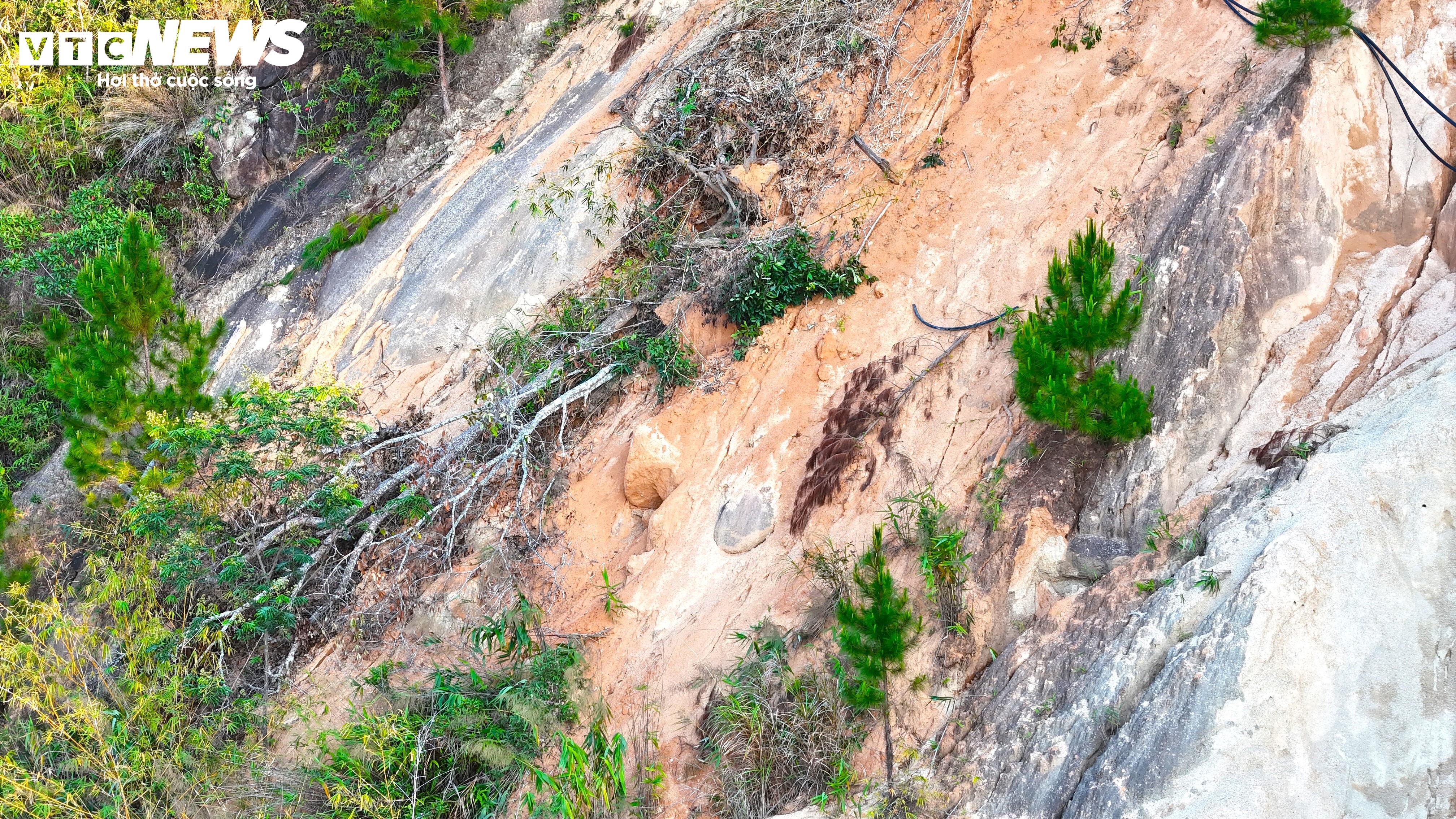 Cây cối, đất đá đổ ngã, nằm cheo leo trên sườn núi tạo cảm giác bất an cho người đi đường bên dưới.