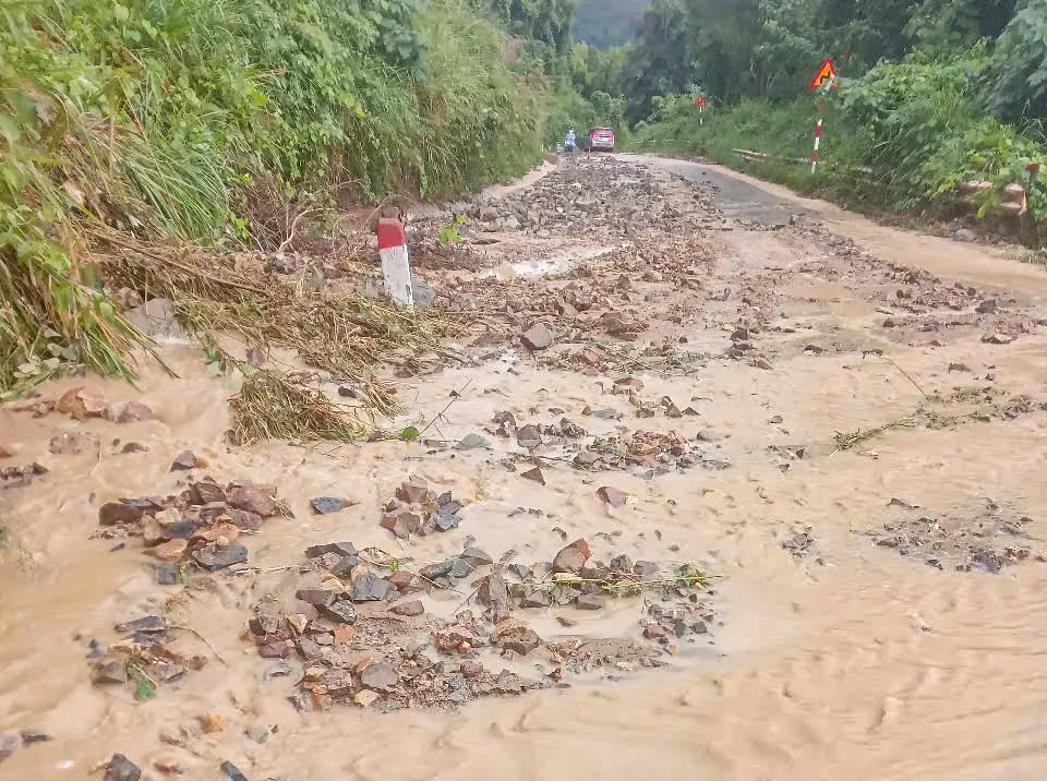 Bốn điểm sạt lở khiến đất đá chắn ngang đường làm các phương tiện không thể di chuyển qua khu vực này.