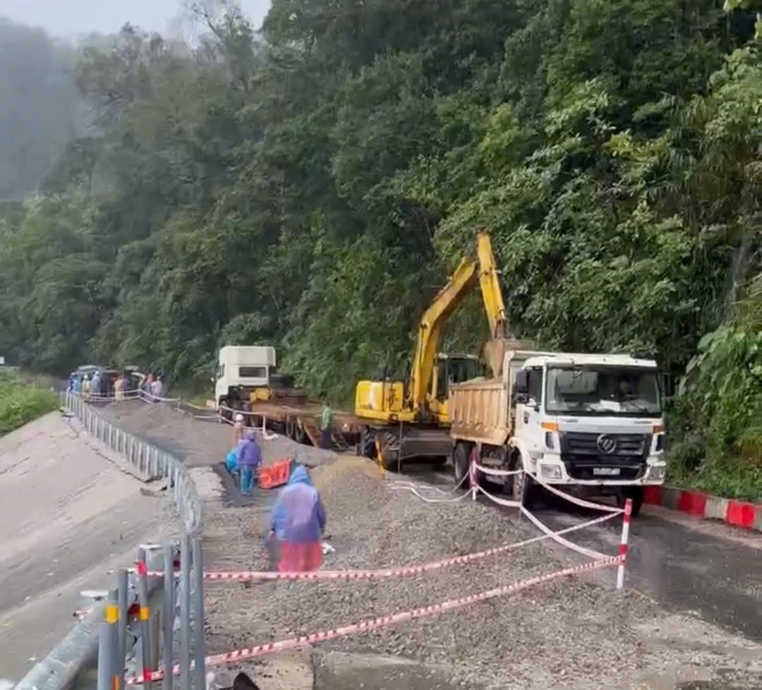 Cũng trên tuyến, tại Km76+900, nền đường xuất hiện vết nứt sâu kèm sụt lún mạnh. Đơn vị quản lý đã khẩn trương đổ đá và gia cố tạm, bước đầu đảm bảo lưu thông bước đầu cho các phương tiện.