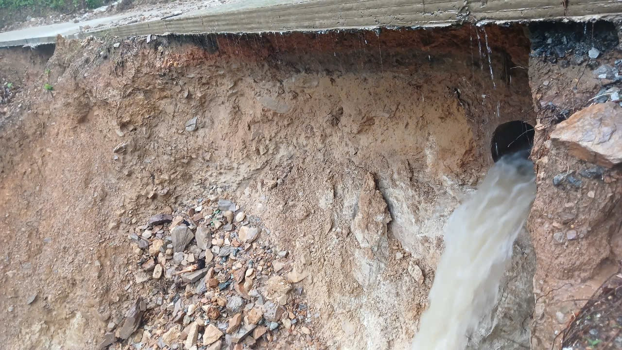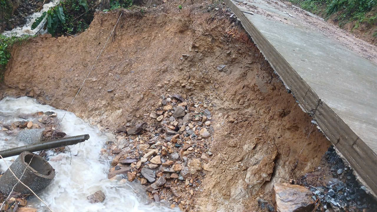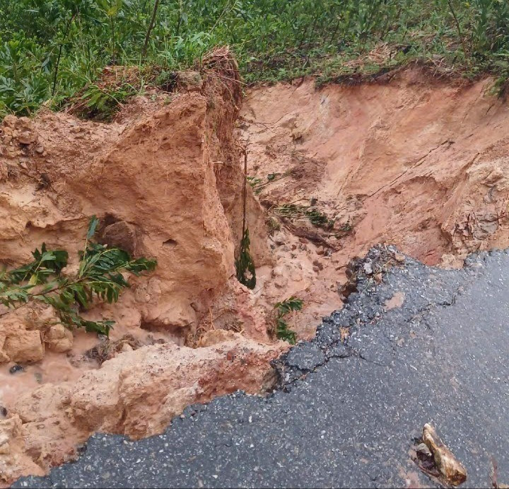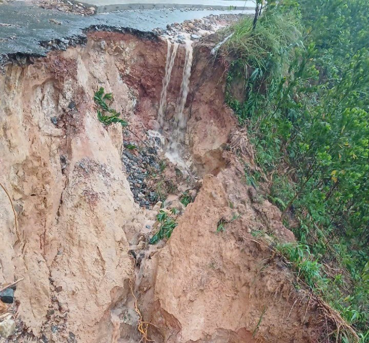 Nước lũ cuốn trôi khoảng 1/3 lòng đường, tạo thành hố sâu dạng hàm ếch trên tuyến đường ĐH83.