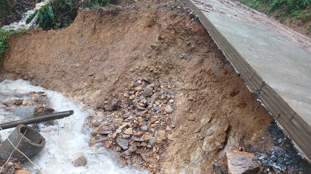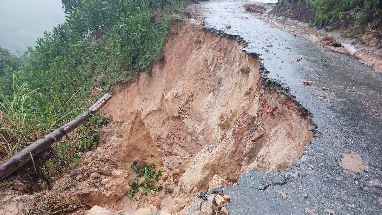 Cũng trong sáng nay, tuyến đường DH83 đoạn từ đỉnh dốc Ông Đường hướng về Thủy điện 1C (thuộc xã Sơn Tây Hạ) bị nước cuốn trôi 1/3 mặt đường, tạo thành vực sâu dạng hàm ếch cực kỳ nguy hiểm.