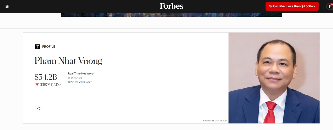 Theo dữ liệu cập nhật thời gian thực của Tạp chí Forbes, tính đến sáng 25/4, giá trị tài sản ròng của ông Phạm Nhật Vượng đã đạt 34,2 tỷ USD.