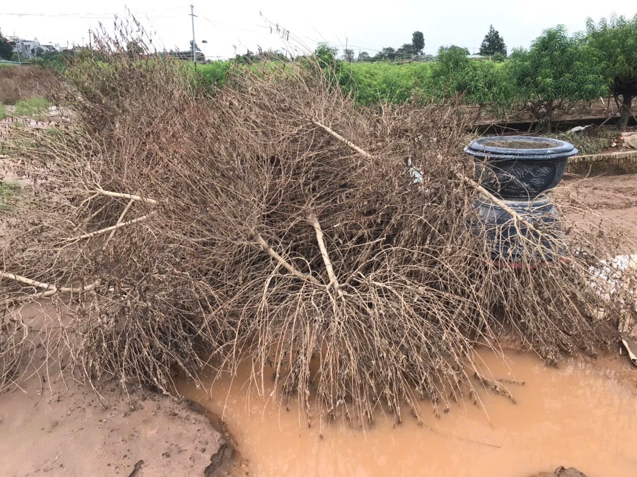 Anh Thăng chia sẻ, ngay trước cơn bão, các hộ gia đình có tiến hành chằng chống, buộc dây để bảo vệ cây. Thế nhưng, “người tính không bằng trời tính”, hàng nghìn gốc đào đã ngập chìm trong nước quá lâu nên rễ cây chết. Cả một vườn đào lớn không còn màu xanh mướt của lá, thay vào đó là màu nâu ảm đạm của cây héo, lá rũ. Sau khi nước rút, hàng trăm gốc đào chết khô, bùn đất bám chặt lên thân cây. Chỉ còn lác đác ít thửa đào còn sự sống do được trồng ở khu vực cao hơn. Còn rất ít những cây đào thân thì héo khô, phần ngọn vẫn còn xanh lá. Nhiều hộ dân cố cứu cây những mong chúng được hồi phục dù biết chi phí đầu tư sẽ không nhỏ.