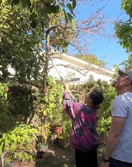 Bà tự lấy gậy khều trái cây cho bạn mình.
