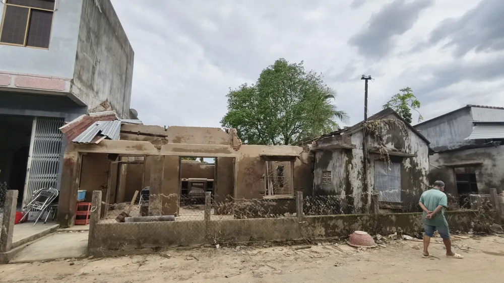 Căn nhà của bà Trần Thị Hương (77 tuổi, thôn Long Châu) bị nước lũ dâng qua nóc, cuốn bay toàn bộ mái ngói. Sau lũ, căn nhà còn trơ trọi mấy bức tường, tài sản trong nhà bị cuốn đi hết.