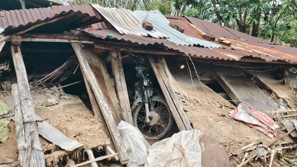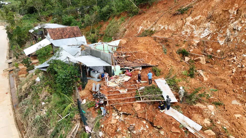 Đất đá từ trên cao đổ xuống đã vùi lấp căn nhà và nhiều tài sản giá trị. Các xe máy bị dồn thành một đống, hư hỏng.