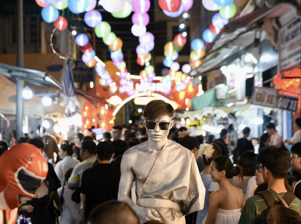 Nhân tượng ở phố lồng đèn Lương Nhữ Học hấp dẫn khách tham quan bởi tạo hình lạ mắt và tư thế bất động hàng giờ.