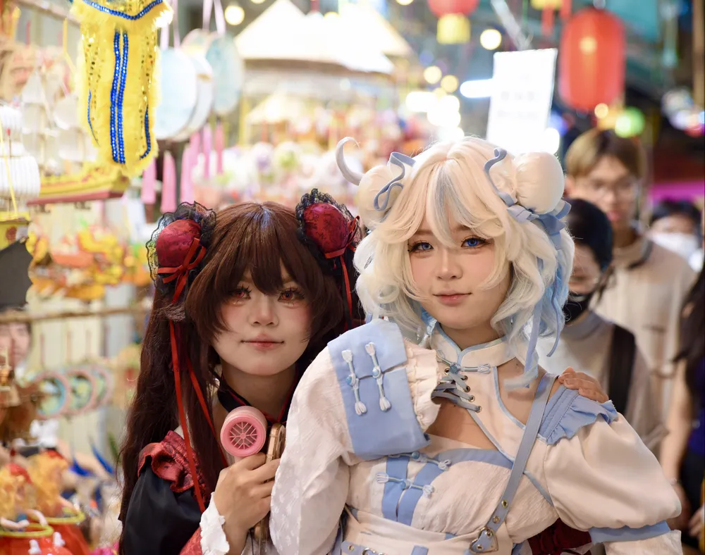Hai bạn trẻ diện trang phục cosplay dạo chơi ở phố lồng đèn. "Đây là lần đầu tiên tụi em tới phố lồng đèn, không khí rất náo nhiệt, làm mọi người quên đi cơn mưa nặng hạt trước đó".