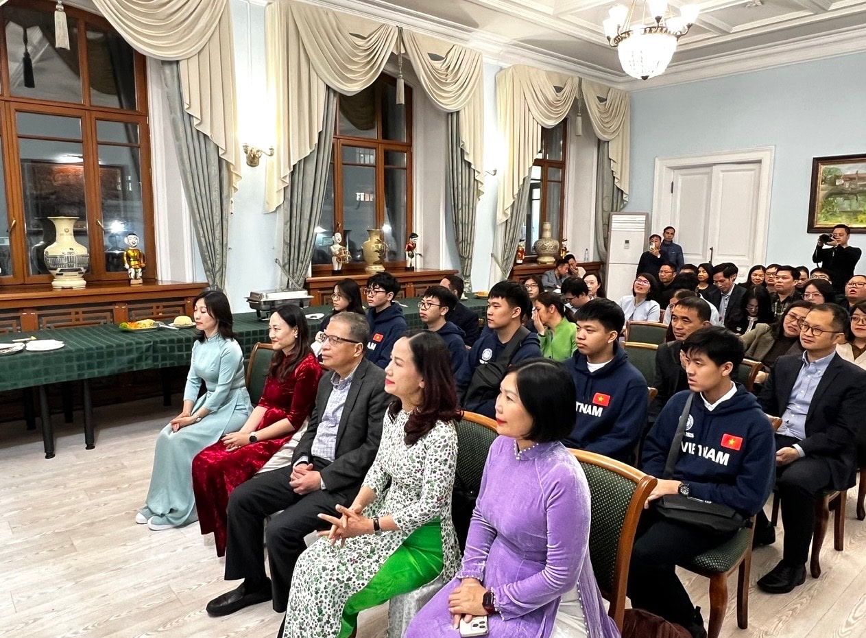 Đoàn đến thăm, báo cáo tại Đại sứ quán Việt Nam tại Liên bang Nga. Ảnh: Sở GD-ĐT Hà Nội