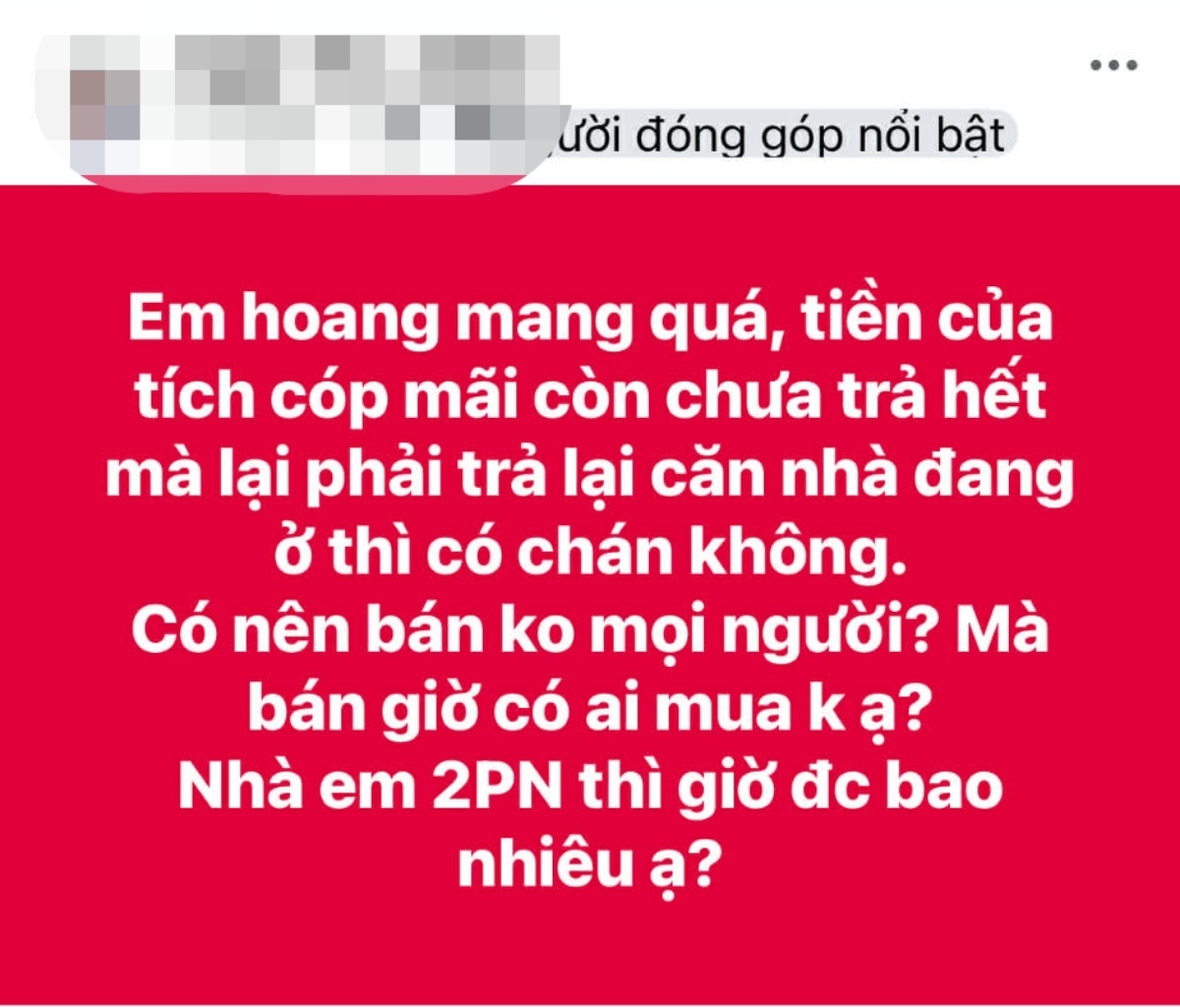 "Tôi biết là bây giờ đang dính lùm xùm như thế này mà rao bán chắc sẽ khó có người mua nhưng tôi vẫn hy vọng có người vì nhu cầu nhà ở cấp bách và muốn mua rẻ thì họ vẫn để tâm. Nếu bán được, dù giá không như kỳ vọng trước đó, nhưng tôi vẫn sẽ hạn chế được thiệt hại. Sau đó, tôi tính vay thêm tiền để mua 1 căn hộ khác ở gần đây", chị M.A chia sẻ.