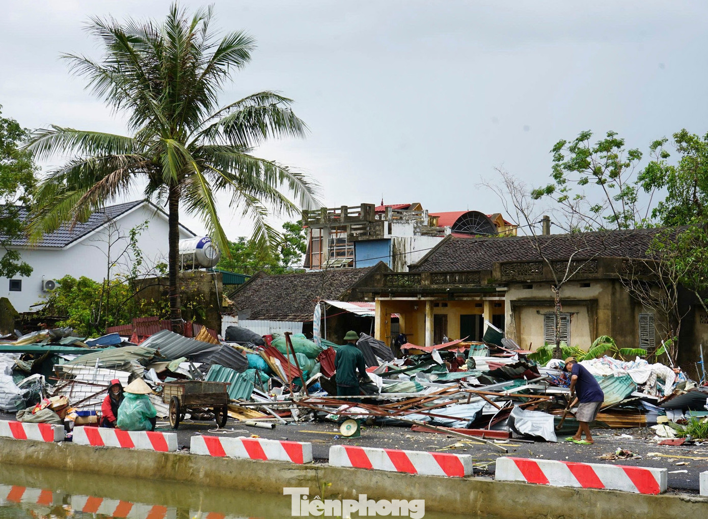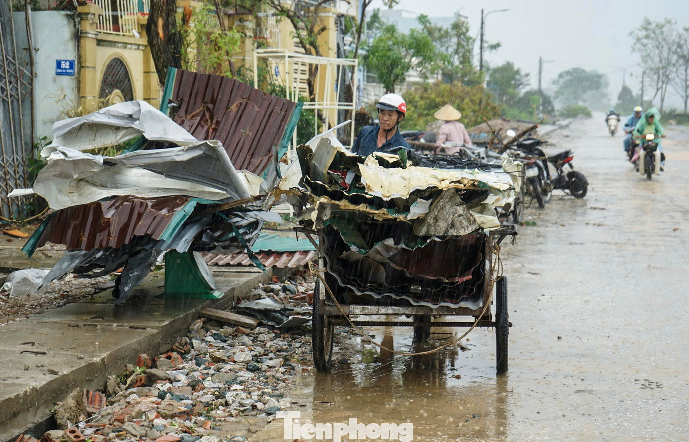 Sau bão, người dân địa phương đã thu dọn, khắc phục hậu quả do lốc xoáy gây ra. Các tấm tôn, sắt thép được gom lại thành đống dọc các tuyến đường ở xã Hoằng Giang.