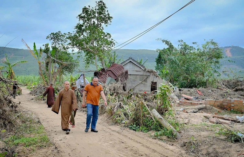 Buổi chiều hôm đó, đoàn đến thăm những hộ gia đình bị lũ cuốn trôi nhà cửa. Tôi xin ghé lại nhà cô gái ban sáng để dâng hương cho người cha vừa mất. Con đường nhỏ ven mé sông không cho xe lớn vào, chúng tôi phải đi nhờ xe chuyên dụng của lực lượng chức năng. Ngôi nhà sau lũ gần như trống rỗng, đồ đạc đã trôi đi hết. Bên trong, linh cữu đặt đơn sơ. Ngoài hiên là một bàn thờ Phật nhỏ, hai cư sĩ đang tụng kinh. Một chiếc bàn khác làm bàn thờ vong, mượn tạm của hàng xóm vì trong nhà không còn nổi một cái bàn.