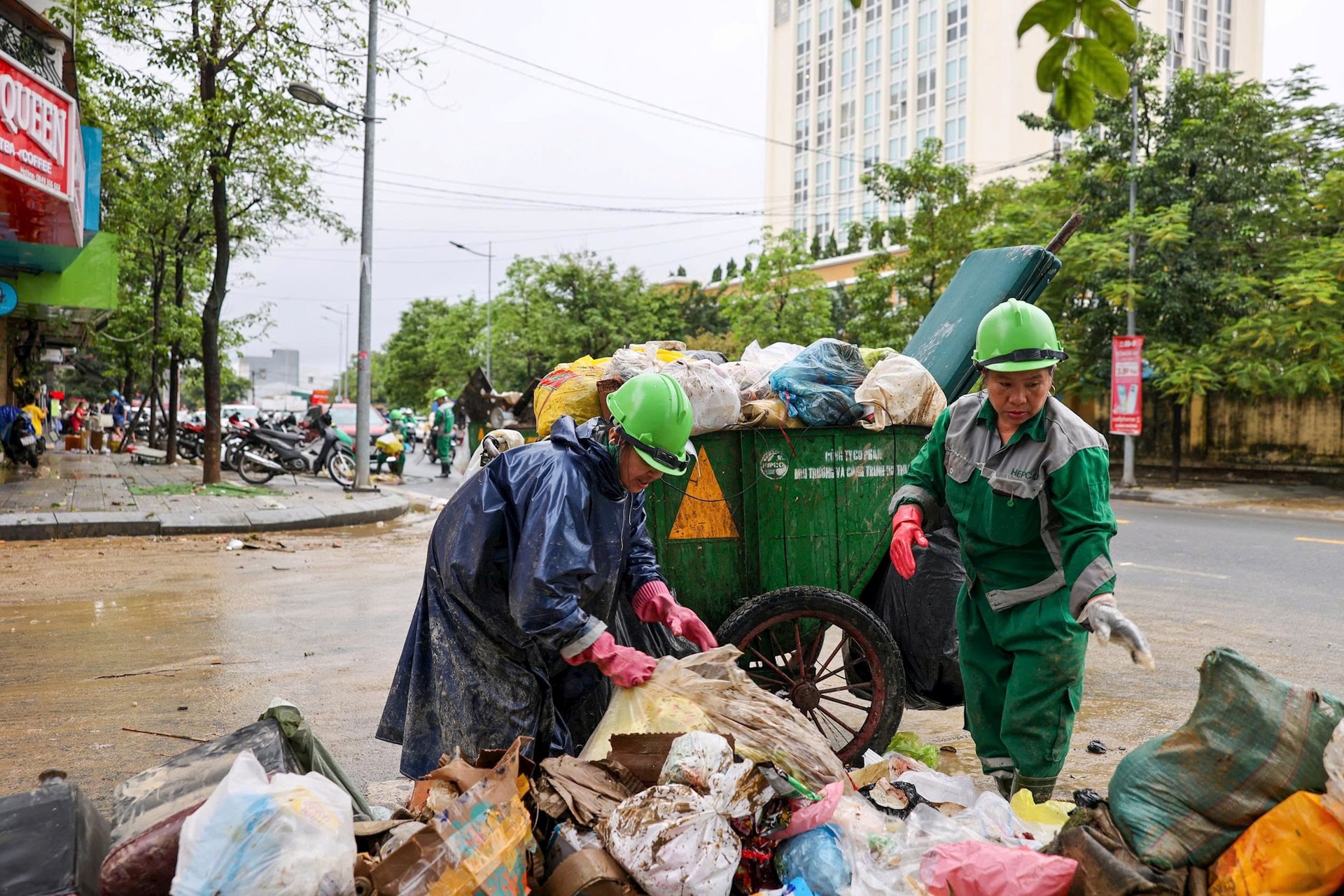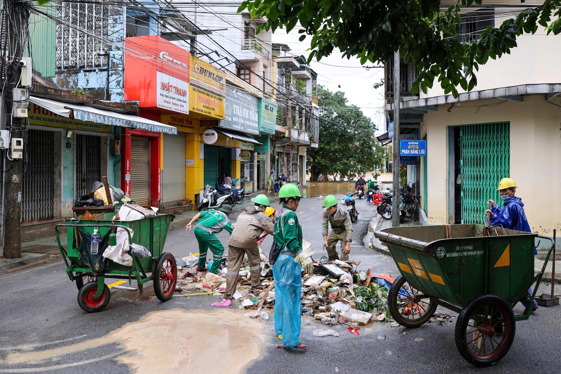 Công nhân vệ sinh đường, thu gom rác thải ngay khi lũ vừa rút.