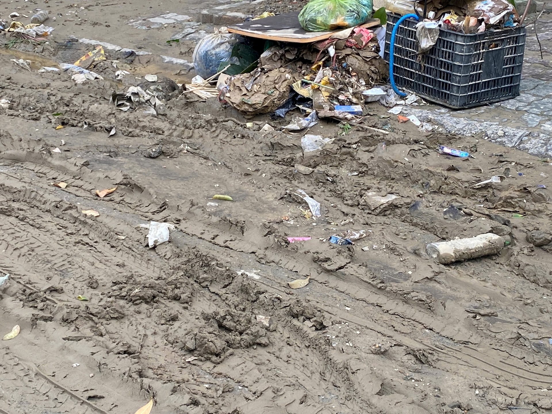 Rác thải và bùn đất chất lại thành đống trên các tuyến đường trung tâm thành phố.