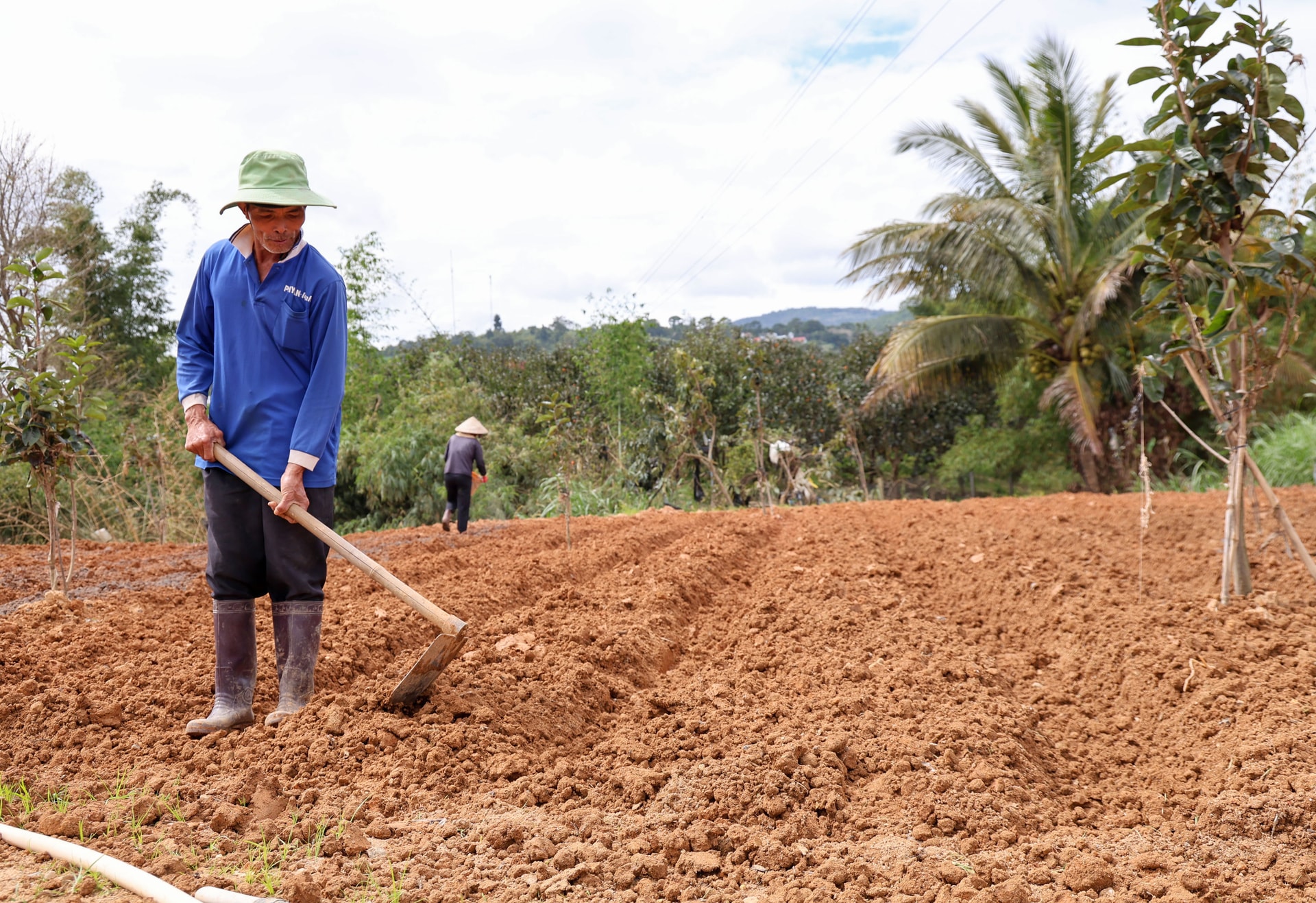 Rời Quảng Lạc, chúng tôi tìm đến vườn của gia đình ông Nguyễn Ngọc Hướng (64 tuổi) ở thôn Lạc Quảng. Khu vườn rộng 5.500 m2 là tài sản lớn nhất của gia đình ông cũng vừa trải qua một đợt cải tạo đất. Điều khiến chúng tôi bất ngờ không chỉ là khối lượng công việc khổng lồ mà vợ chồng ông đã nỗ lực thực hiện như: cày xới, lên luống, rải phân, mà còn là việc đầu tư cải tạo chất lượng đất. Ông bà đã chi gần 5 triệu đồng, một số tiền không nhỏ sau thiên tai, để mua 3 xe đất về cải tạo vườn.