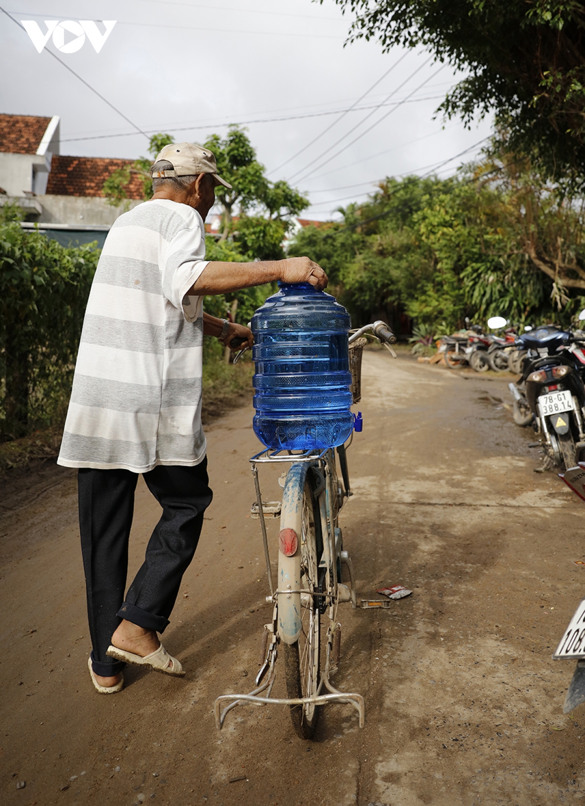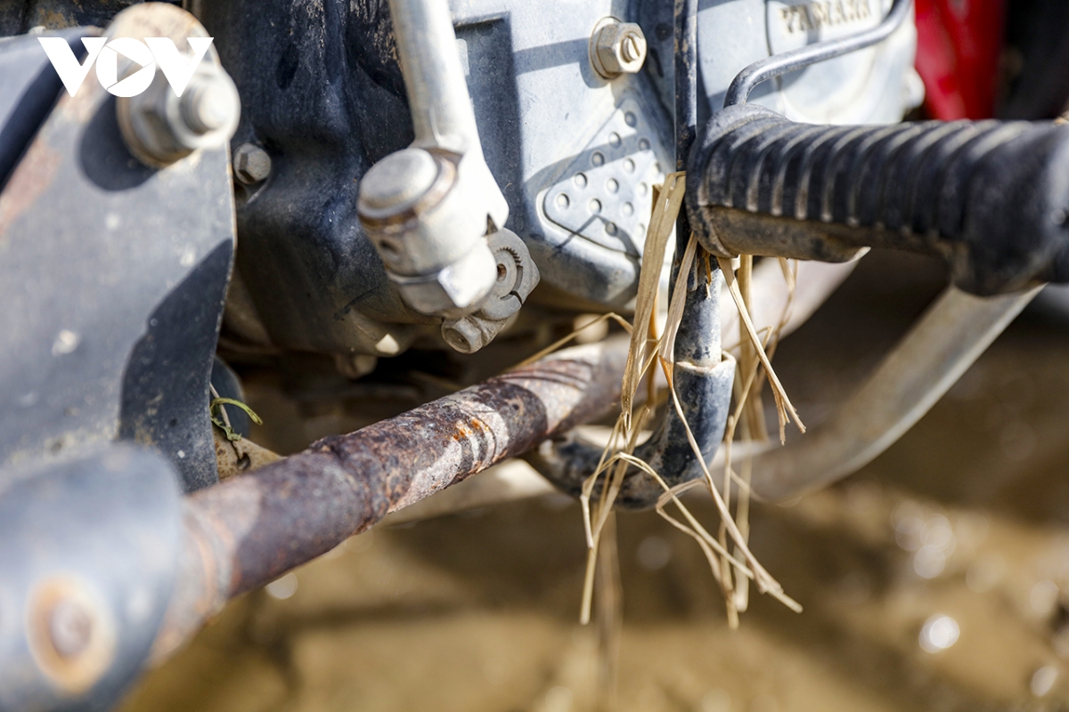 Chiếc xe đạp của cụ già cũng ngấn vết bùn ngập bánh xe