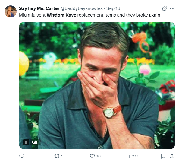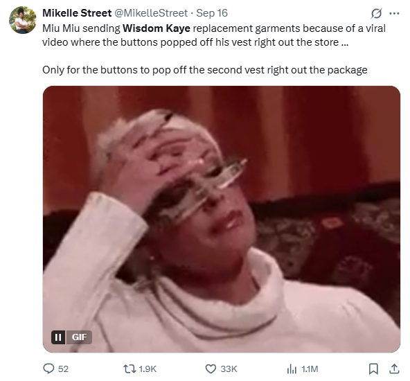 Sự việc xảy ra vào khoảng giữa tháng 9 vừa qua, hút gần 19 triệu lượt xem trên TikTok. Mọi chuyện bắt nguồn từ video chia sẻ trải nghiệm mua hàng Miu Miu “tệ hại” của Wisdom Kaye - một nhà sáng tạo nội dung nổi tiếng trên TikTok.