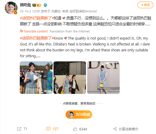 Mạng xã hội Weibo xôn xao về khoảnh khắc nữ đại sứ thương hiệu toàn cầu di chuyển tại khuôn viên sự kiện với phần gót giày bị long ra, tách rời khỏi đế. Sao nữ chỉ có thể đi bằng phần mũi bàn chân, phải kiễng lên để giữ thăng bằng.