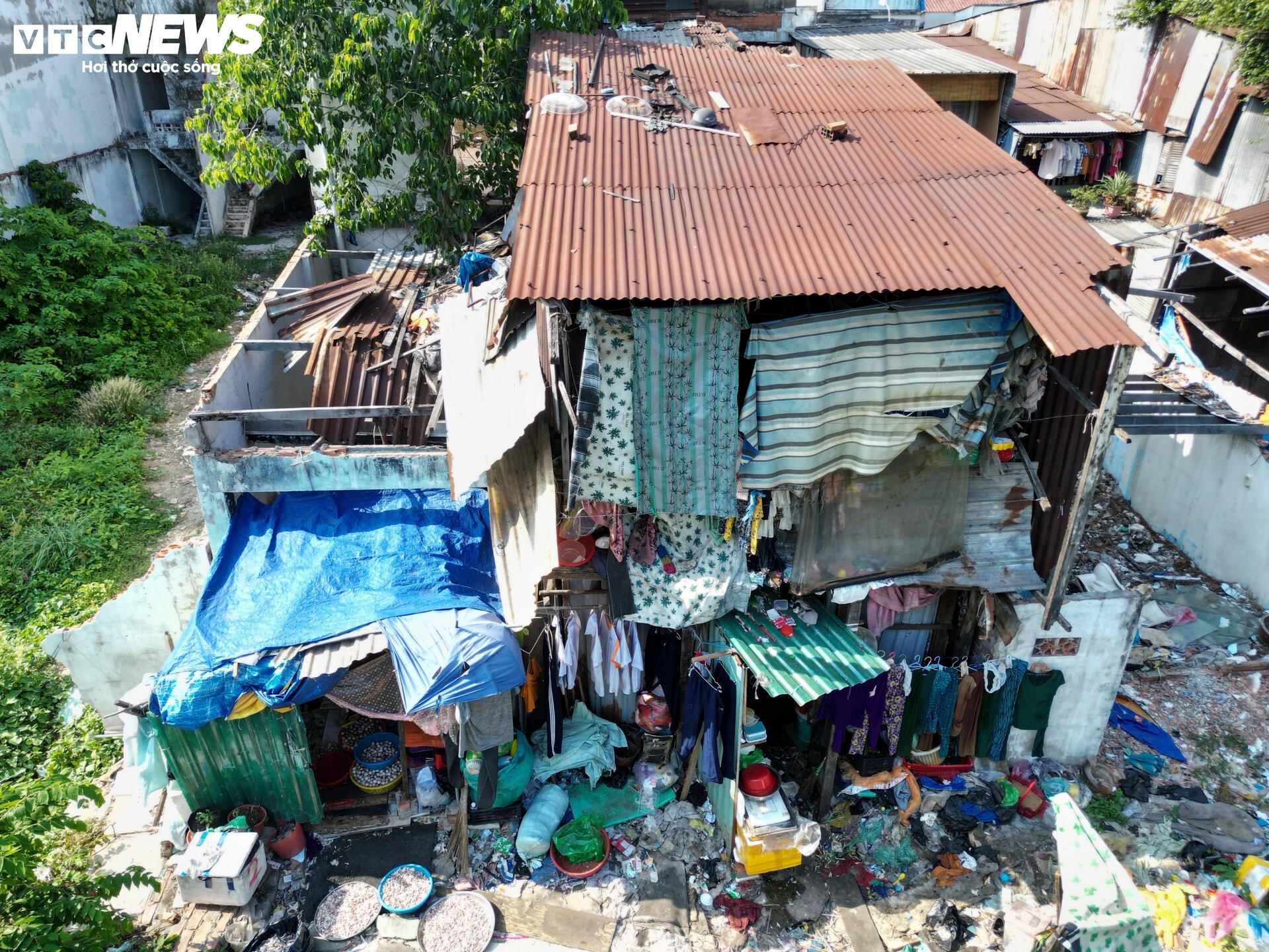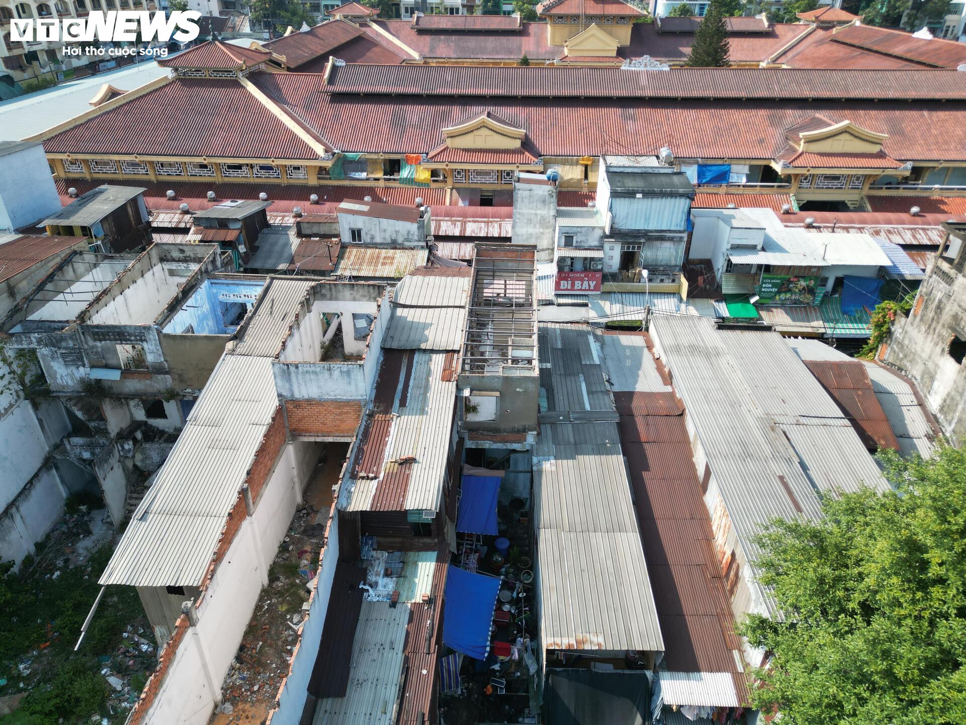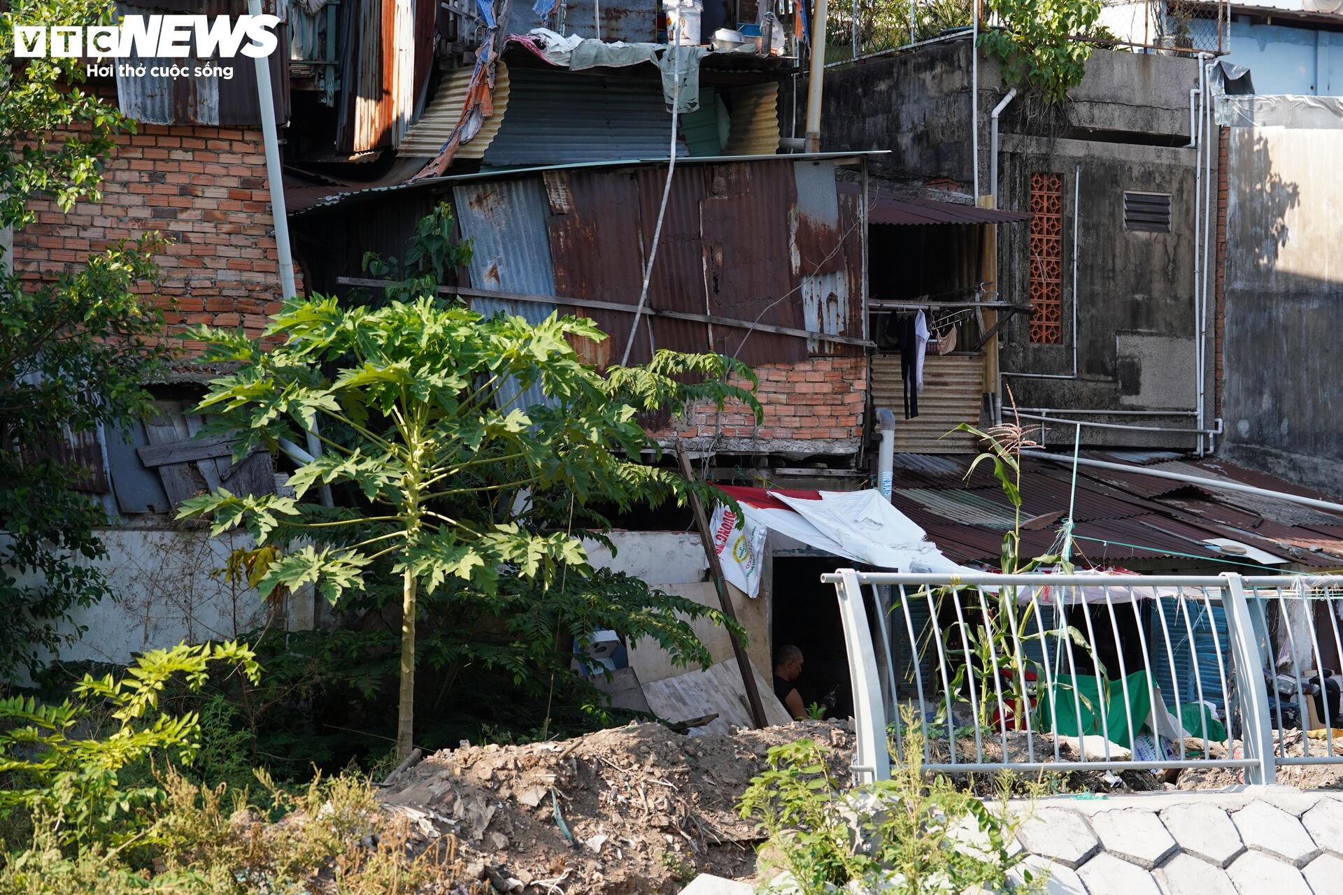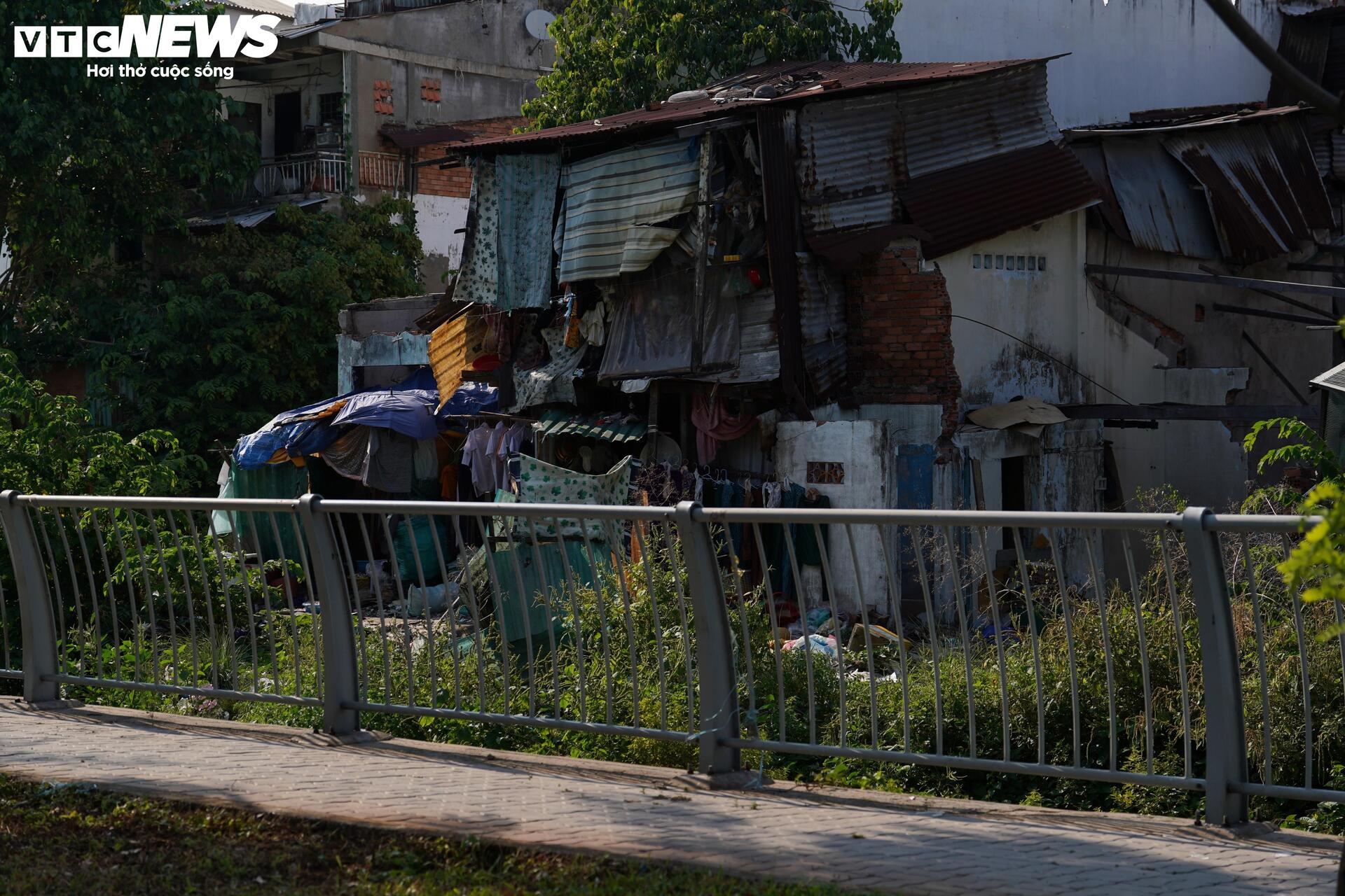 Các căn nhà còn lại nằm xen cài với khu vực đã bàn giao, phần lớn xuống cấp, một số được quây tôn, cơi nới tạm.
