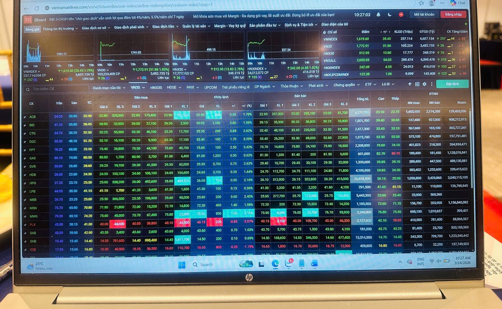 Kết phiên sáng 24/3, sàn HoSE có 274 mã tăng và 59 mã giảm, VN-Index tăng 31,52 điểm (+1,98%), lên 1.622,69 điểm.