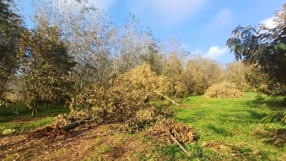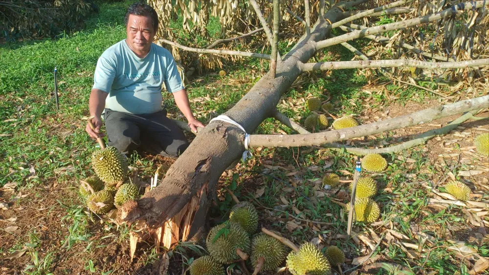 Tuy nhiên, bão số 13 quét qua, khiến hàng loạt trái sầu riêng rụng, hư hỏng. Hơn thế, vườn sầu riêng của ông Hiếu bị gãy đổ, bật gốc 30 cây, gây thiệt hại nặng nề.