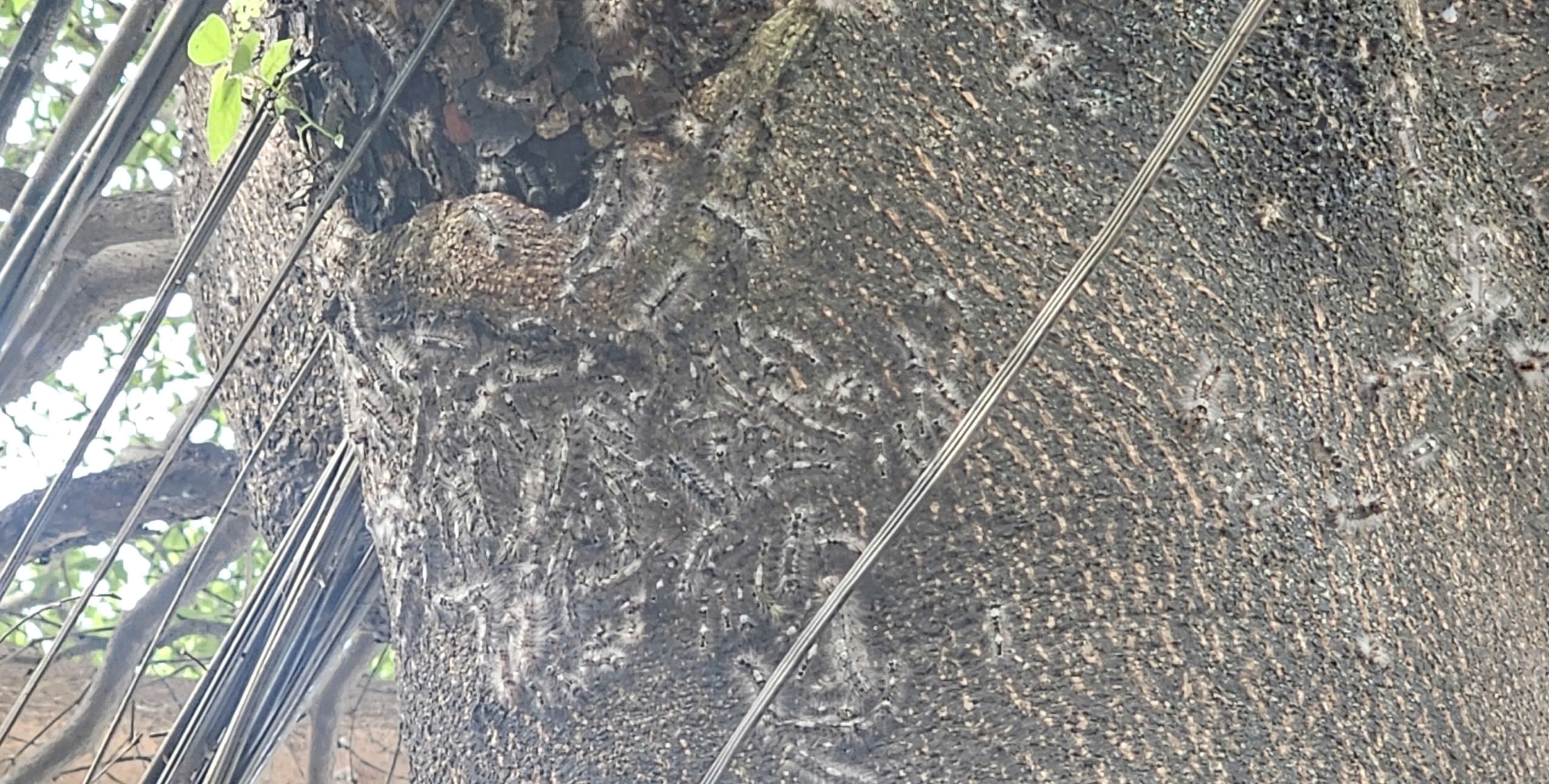 Sâu róm bò trên thân cây, tạo thành từng mảng đen, sau đó bò xuống mặt đường và tường nhà.