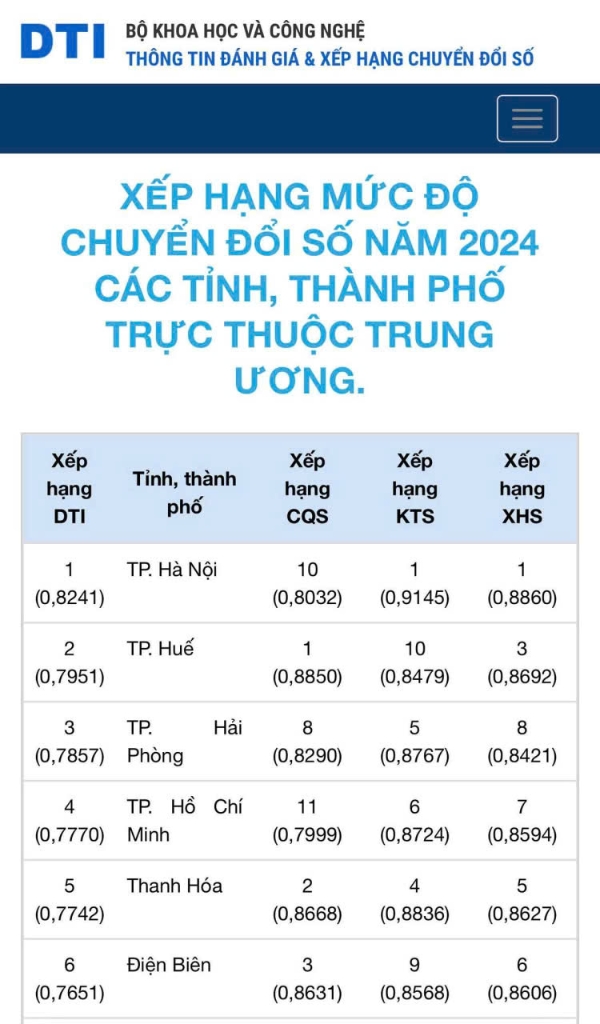 Cụ thể, theo bảng xếp hạng chỉ số chuyển đổi số (DTI) năm 2024 trên phạm vi toàn quốc, đối với nhóm 63 tỉnh, thành phố (trước sáp nhập) thì Thành phố Huế đứng vị trí thứ 5, sau TP. Hồ Chí Minh, Đà Nẵng, Hải Phòng và Hà Nội. Tuy nhiên, đối với nhóm đánh giá 34 tỉnh, thành phố (sau sáp nhập) thì Huế đã vươn lên đứng thứ hai sau Hà Nội, và đứng trên Hải Phòng (thứ ba), TP. Hồ Chí Minh (thứ tư) và Thanh Hóa (thứ năm).