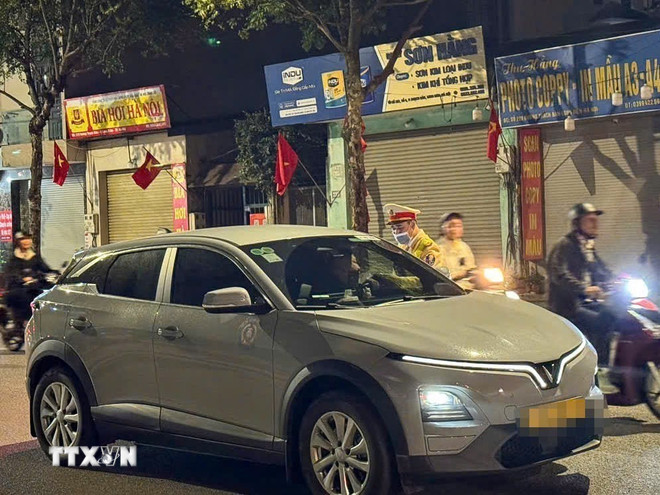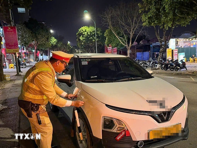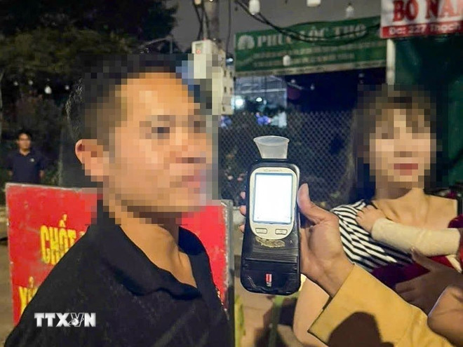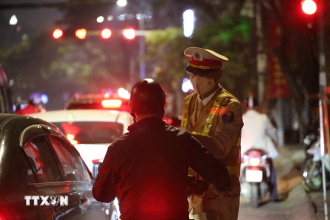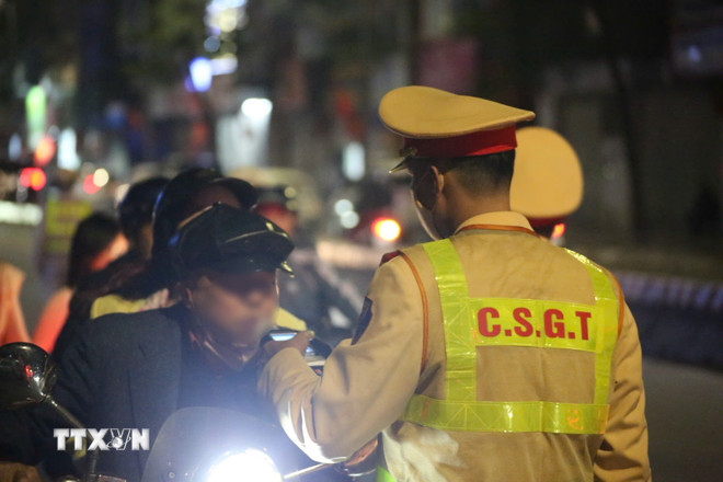 Thống kê trong tối 23/2/2026, Đội Cảnh sát giao thông số 5 (Phòng Cảnh sát giao thông Hà Nội) đã phát hiện, xử lý 17 trường hợp vi phạm về nồng độ cồn, phạt tiền ước tính 96 triệu đồng. (Ảnh: TTXVN phát)