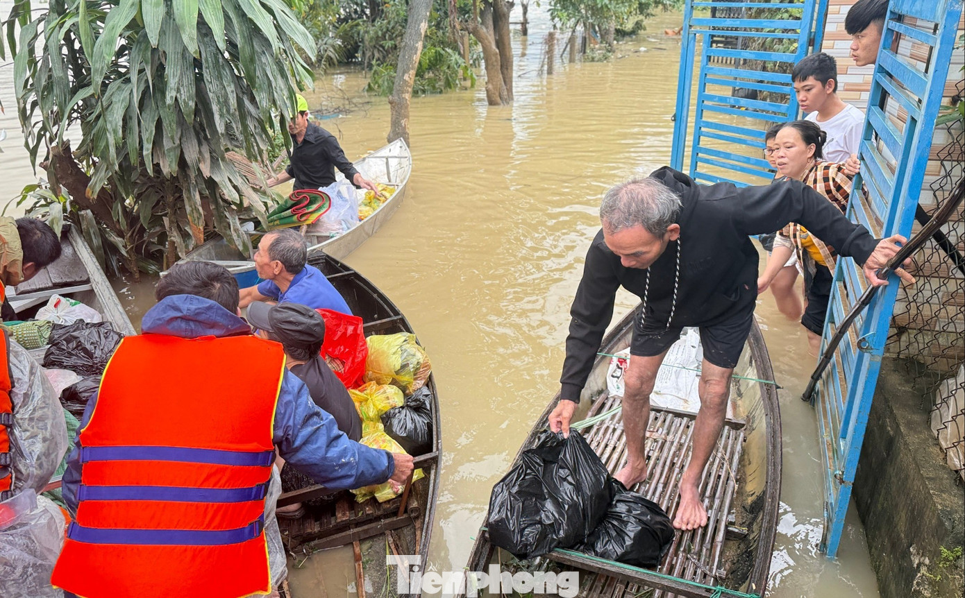 Các lực lượng tiếp tế lương thực cho người dân vùng còn bị nước lũ bao vây ở xã Hòa Thịnh, trong ngày 22/11. Ảnh: Trương Định