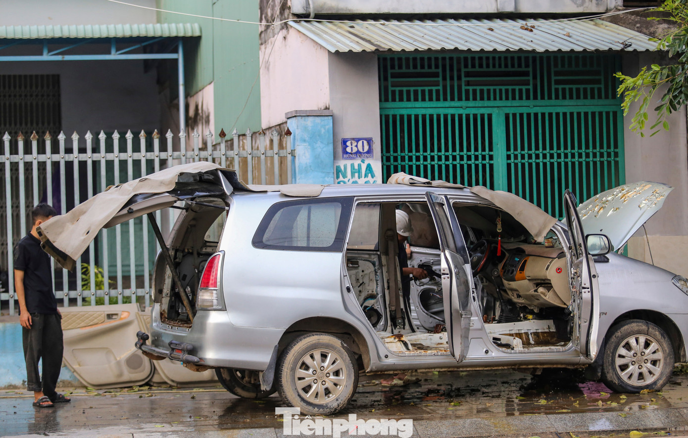 Chiếc xe còn lấm lem bùn đất sau trận lũ dữ được thợ cứu chữa. Ảnh: Trương Định.